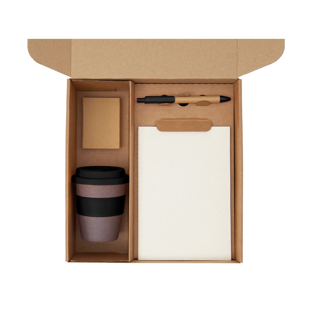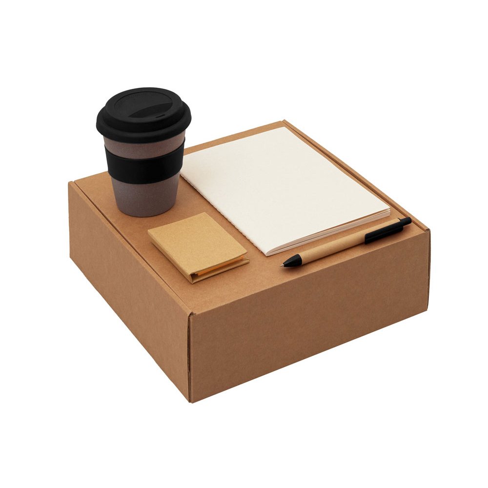 - Блокнот бумага из переработанных тетра паков/ручка картон,пластик/стакан 50% бамбуковое волокно/50% полипропилен/коробка картон