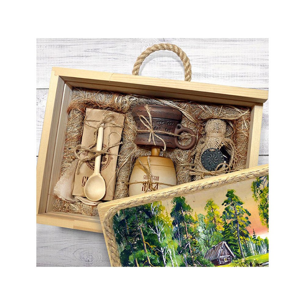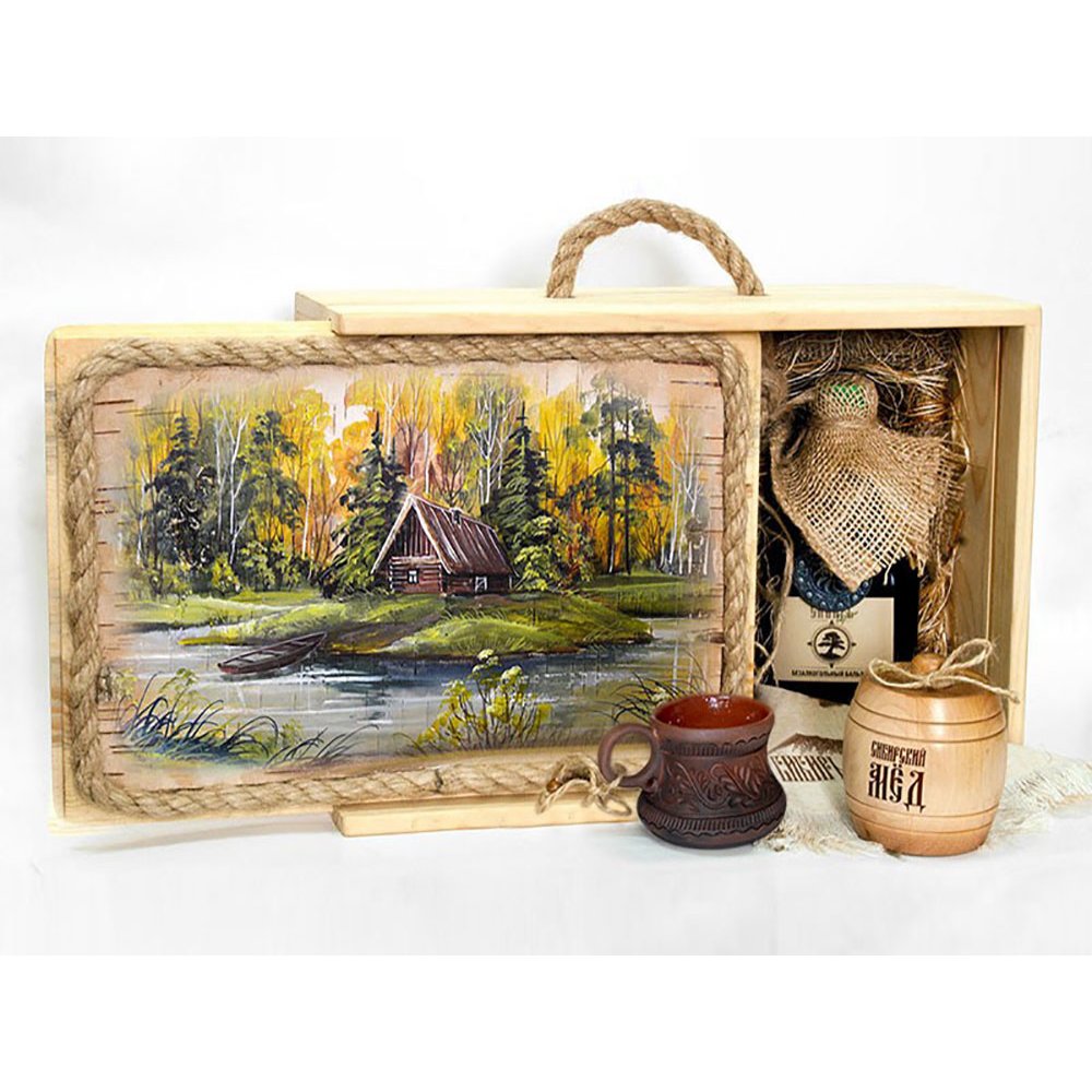 - Подарочный набор в уникальном деревянном коробе ручной работы с рисунком на бересте: - безалкогольный бальзам “Сибирь” с металлическим оберегом, - зеленый чай из целебных, сибирских трав, - настоящий сибирский мед в бочонке, - кедровая ложка, - льняная салфетка, - керамическая чашка ручной работы.