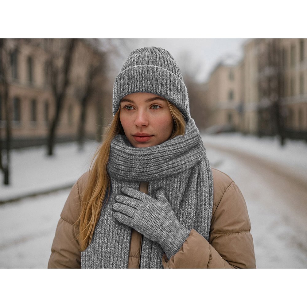 - Комплект выполнен из мягкого трикотажа, что делает его особенно комфортным в носке. Вязаная шапка рибом 1х1 плотно и удобно садится по голове, сохраняя тепло и подчеркивая лаконичный стиль. Шарф из такого же материала и с аналогичной вязкой рибом 1х1 легко драпируется, позволяя носить его как свободно, так и плотно укутываясь — в зависимости от погоды и настроения. Вязаные перчатки из мягкой акриловой пряжи, также связаны резинкой 1х1. Они не только защищают от холода, но и оснащены функцией "тачскрин" на большом и указательном пальце, благодаря чему пользоваться смартфоном удобно даже на улице. Вместе шапка, шарф и перчатки создают практичный и универсальный комплект Nordend — теплый, удобный и идеально подходящий для холодного сезона.