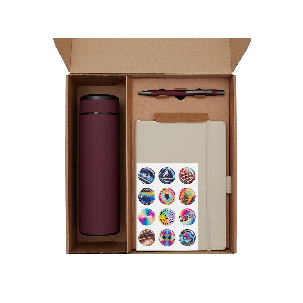 - Набор "Warmpage" станет отличным подарком для сотрудников, клиентов и партнёров, подчеркнёт внимание к их комфорту и заботу о деталях. Он уместен как корпоративный подарок на праздники, юбилеи и деловые мероприятия, так и в качестве welcome-набора для новых коллег. Набор объединяет всё необходимое для комфортного и уютного рабочего дня: Блокнот для идей, заметок и планов на день; Ручка, которая всегда под рукой; Термос, объёмом 420 мл. позволит любимому напитку всегда оставаться горячим; Чай «Глинтвейн», который подарит энергию и настроение; Попсокет для удобного удержания смартфона и комфортного использования; Набор стикеров — для ярких акцентов и персонализации вещей. Универсальный ложемент обеспечивает аккуратное размещение и надёжную фиксацию элементов, делая набор эффектным и презентабельным при вручении. Дополнительное преимущество — набор доступен в конструкторе наборов: компоненты можно заменить и собрать индивидуальный вариант под стиль компании или вкусы получателя.
