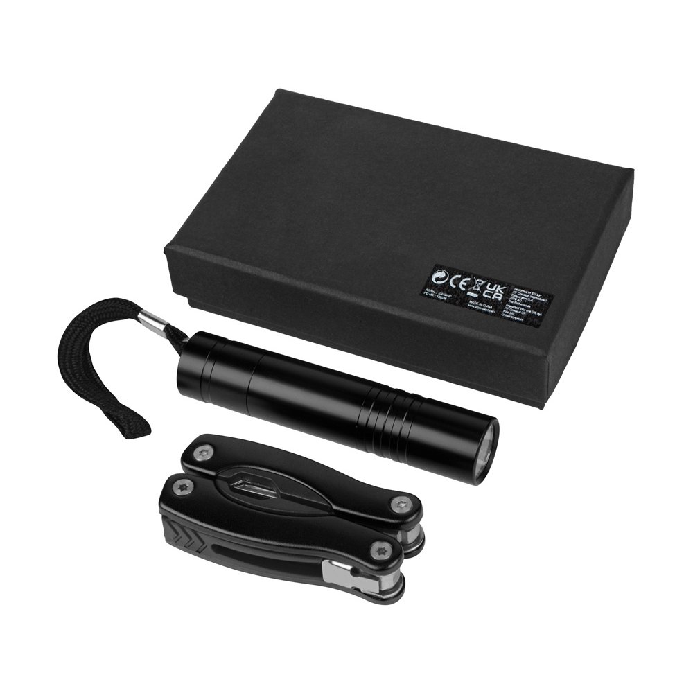 - Подарочный набор Scout с многофункциональным ножом и фонариком. 11-тифункциональный инструмент с диодным фонариком упакован в черную картонную коробку. Батарейки в комплекте. Алюминий.