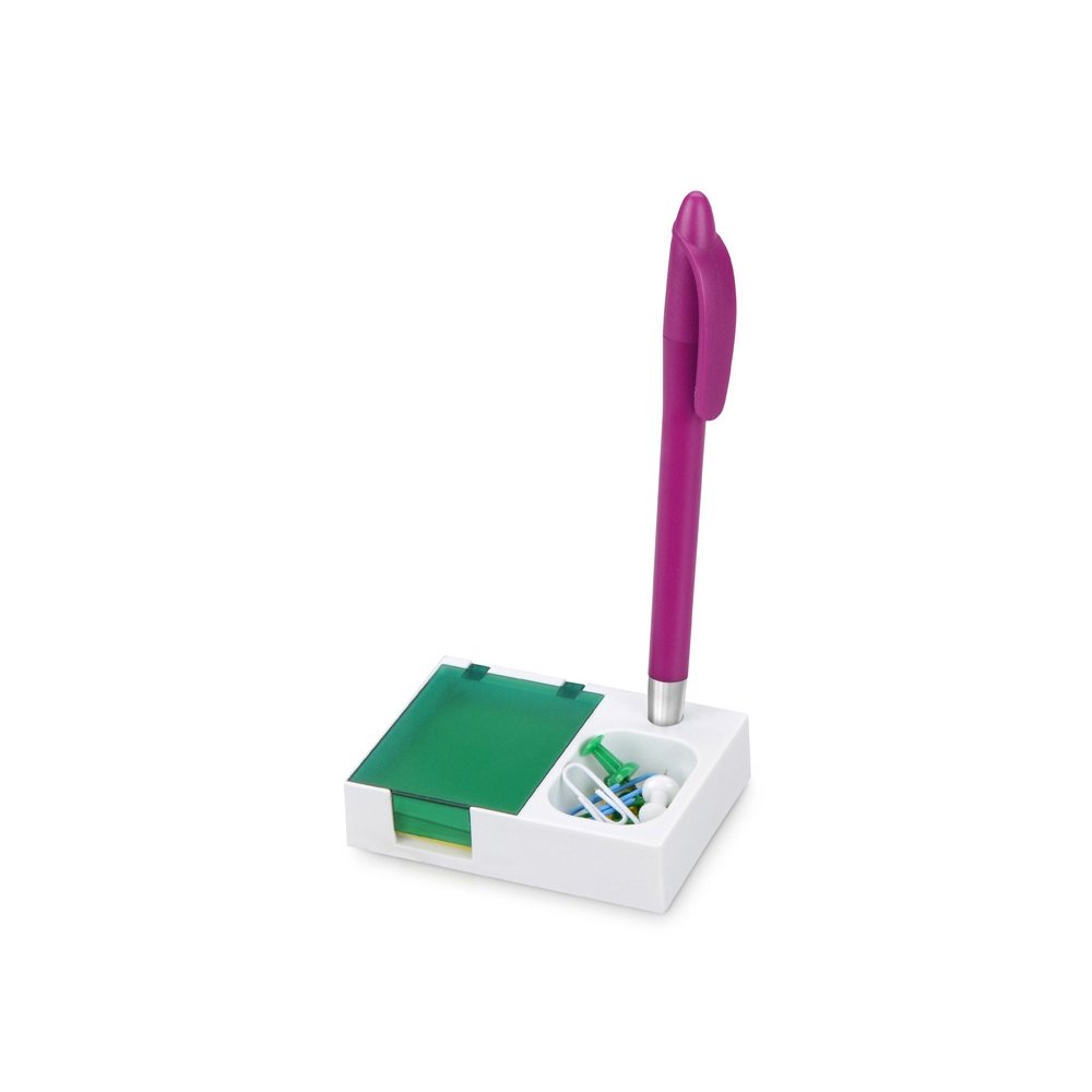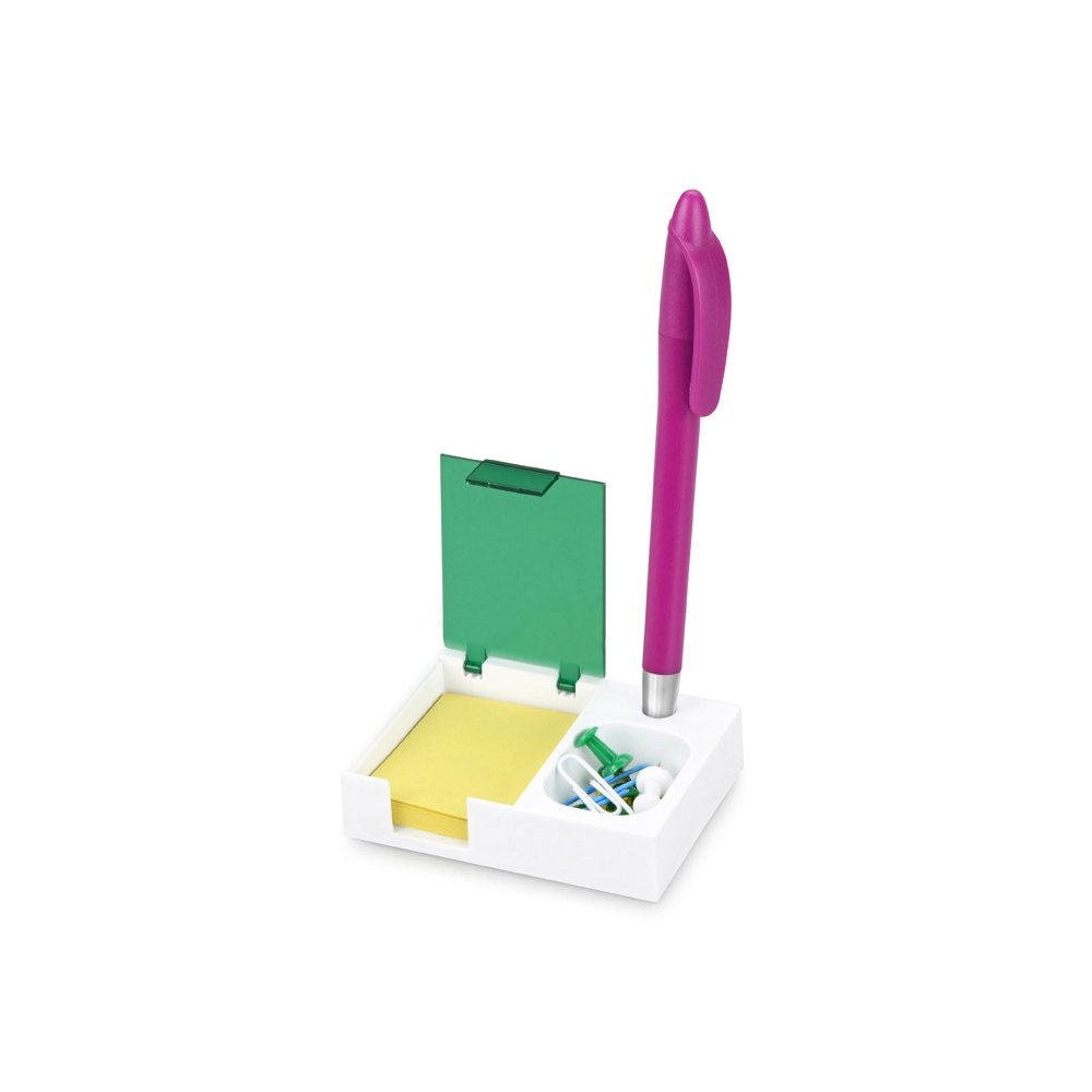 Яркая и удобная поставка под ручку, канцелярские скрепки и бумажный блок (4 х 5 см) превосходно организует ваше рабочее место. Отличный подарок при проведении промо-акций.