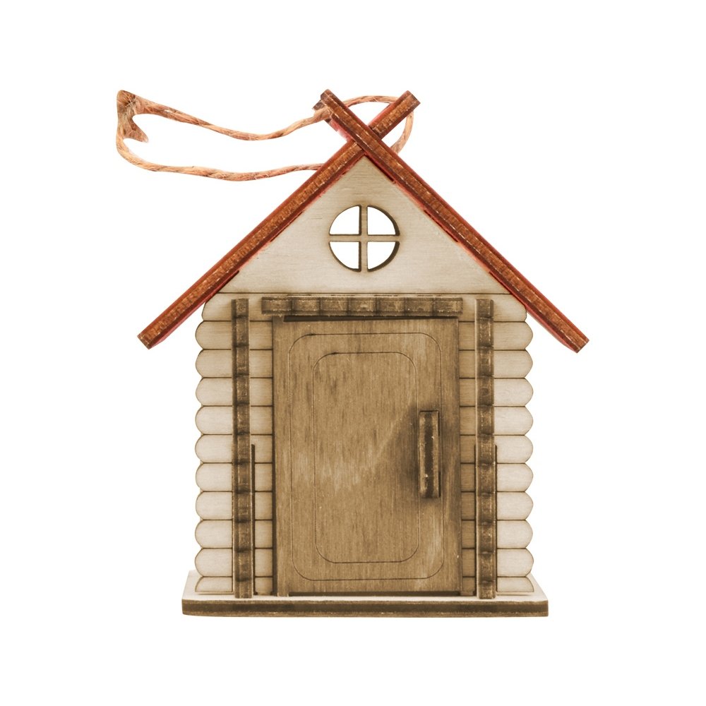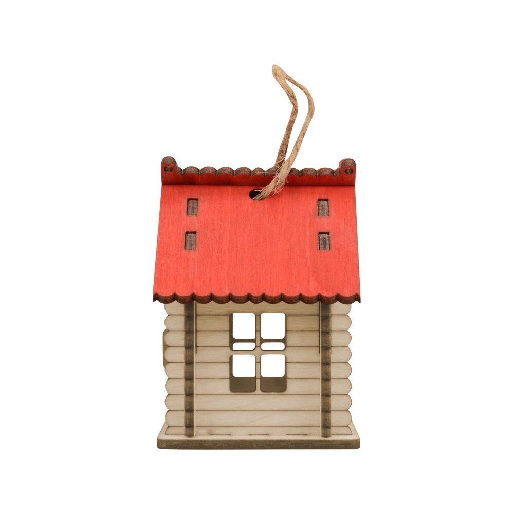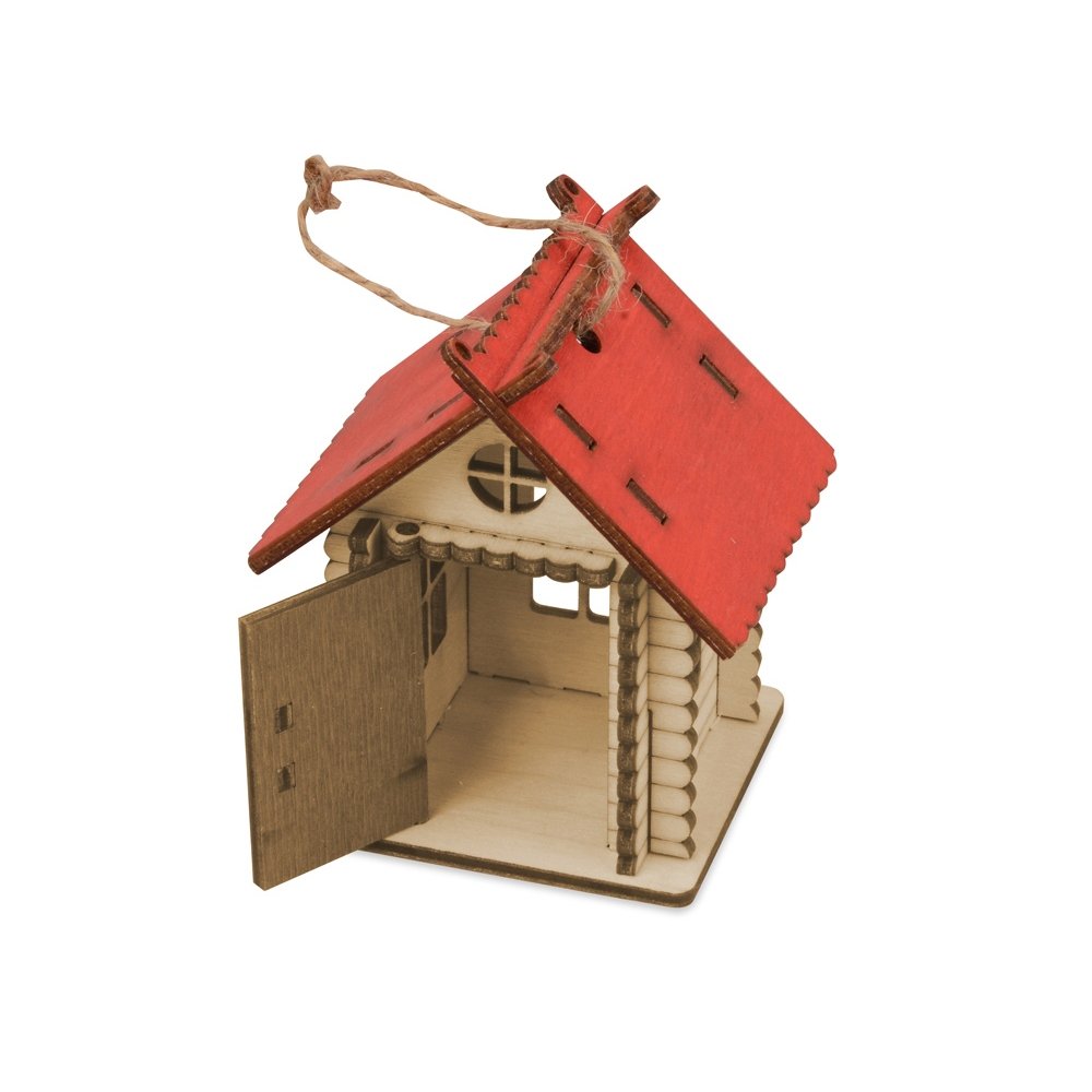 - Небольшая елочная игрушка в виде лесной избушки. Дверца избушки открывается, внутрь можно положить небольшой сувенир, конфету или маленький светодиодный фонарик. Избушка с небольшим светящимся огоньком отлично украсит ваше новогоднее дерево, а несколько таких игрушек на елке с легкостью заменят новогоднюю гирлянду.