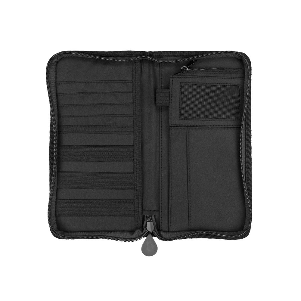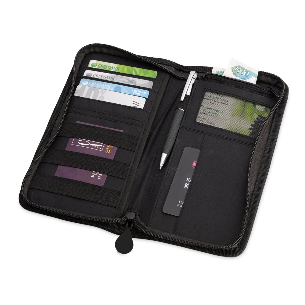 - Портмоне для путешествий из прочного полиэстера сделает любую поездку более комфортной. Здесь предусмотрено место для паспорта, билетов и денег, кармашки для пластиковых карт, удобный держатель для ручки и фиксаторы на резинках для карточек или документов. Портмоне закрывается на молнию, а на его внешней стороне предусмотрен дополнительный карман для посадочного талона или других документов, которые приходится все время доставать. Портмоне «Вест» – прекрасный подарок для тех, кто любит путешествовать и проводит много времени в разъездах.