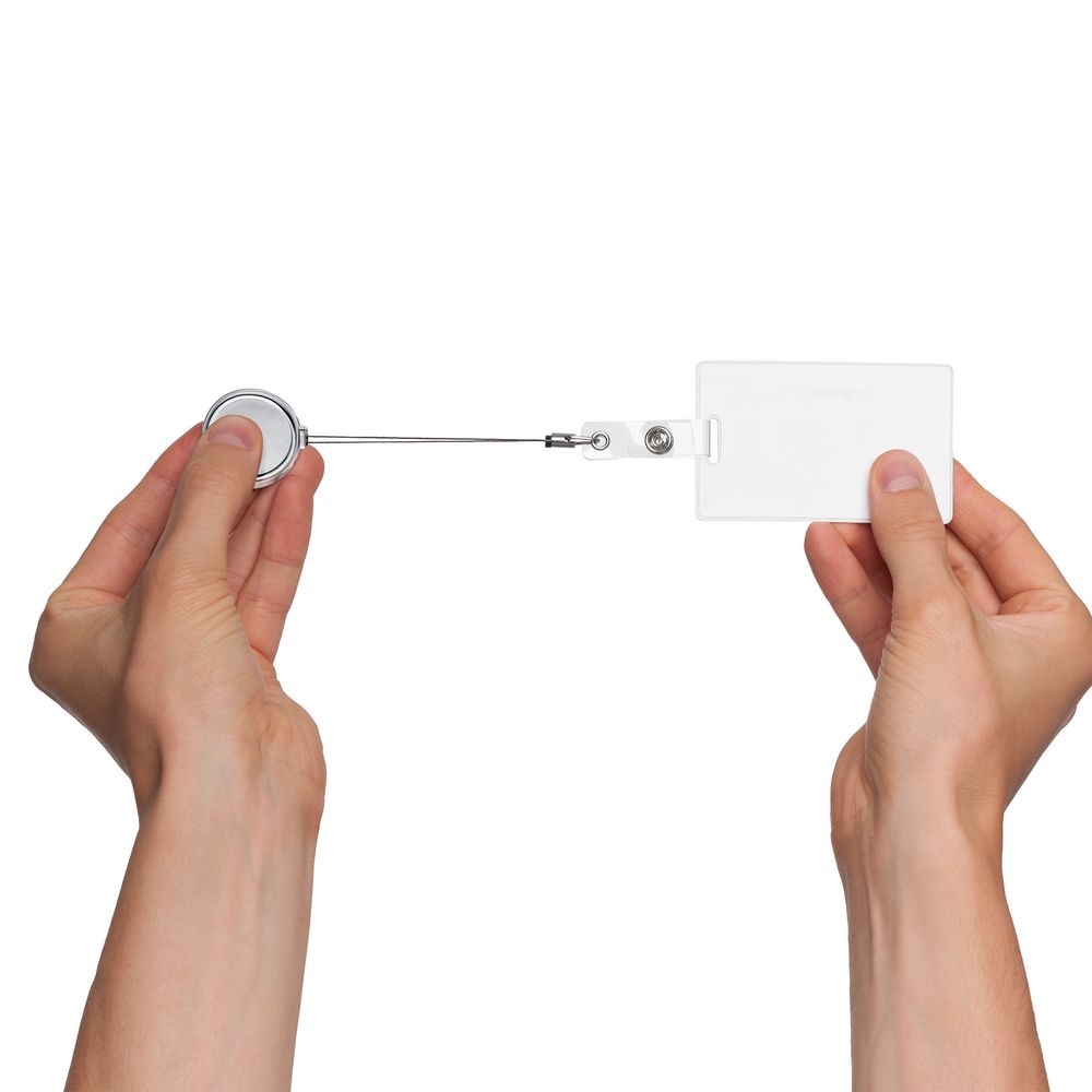 Ретрактор крепится к одежде, а с другой стороны можно поместить бейдж, визитку или магнитную карту. В корпусе спрятан сворачивающийся шнур, который позволяет при необходимости демонстрировать содержимое держателя, не снимая его.