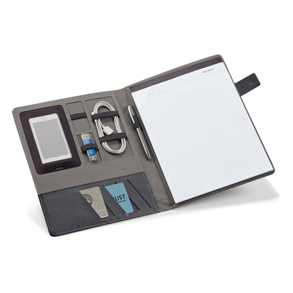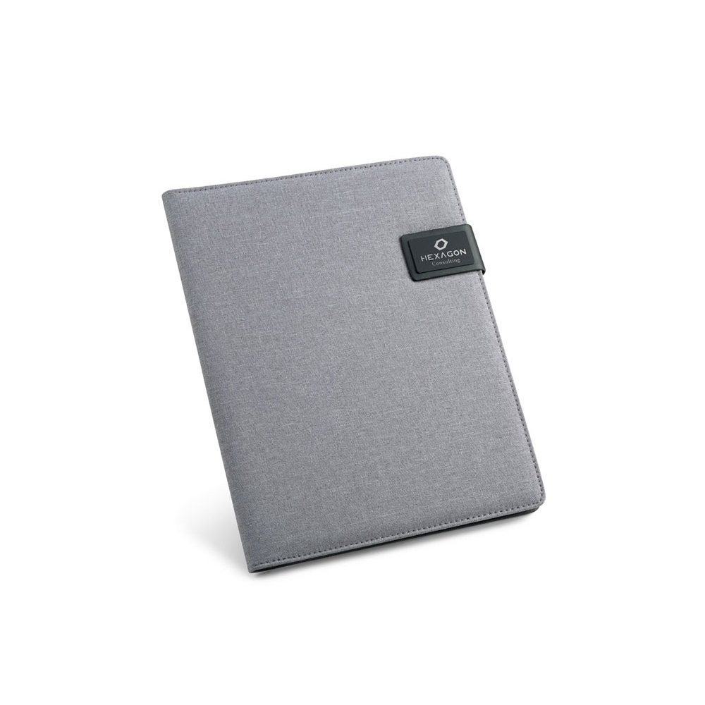 - Папка A4 из искусственного льна и кожзаменителя. Имеет застежку на магните с пластинкой для персонализации. Внутри имеет блокнот из 20 листов в линейку, держатель для шариковой ручки (ручка не входит в комплект), карман для смартфона и держатели для кабелей или других принадлежностей (в комплект не входят). 233 x 310 x 18 мм | Пластина: 50 x 30 мм. Вид нанесения, рекомендуемый поставщиком: трансфер, гравировка.