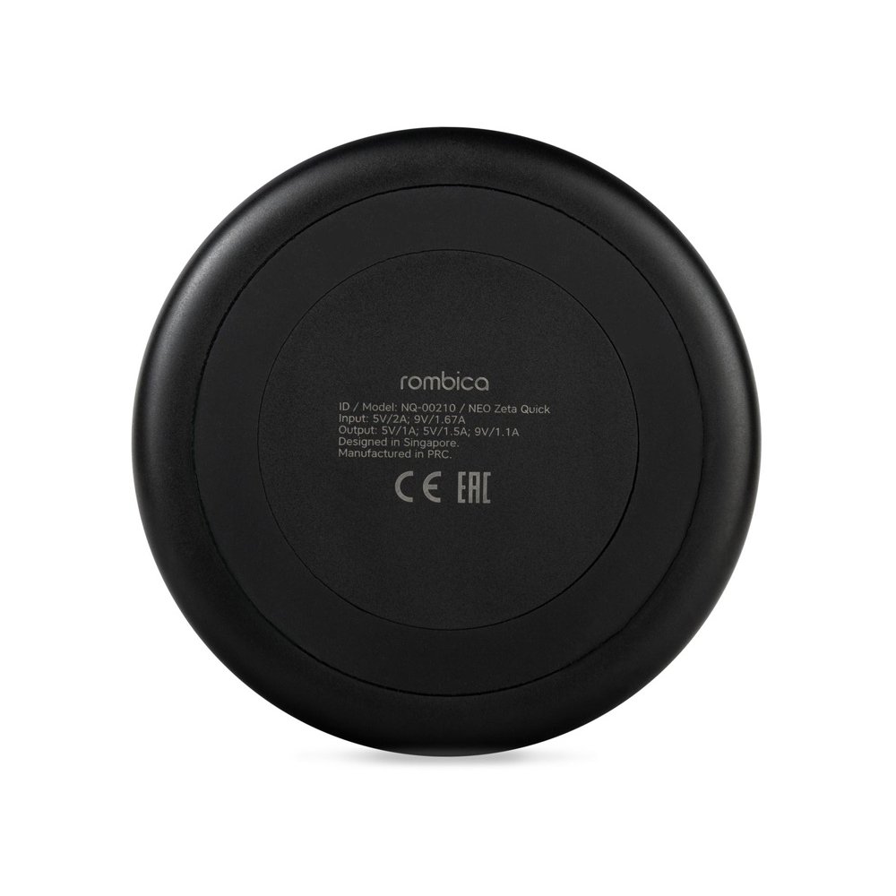 - Беспроводное зарядное устройство Rombica NEO Zeta Quick. • Совместимо с устройствами, изготовленными по стандарту Qi. • Мягкая подсветка. • Быстрая зарядка. Поддерживает быструю зарядку в режимах 7.5W и 10W. При включенном в сеть БЗУ по контуру горит зеленая подсветка в ритме «Дыхание», в режиме заряда мобильного телефона подсветка светится статично зеленым цветом. *для зарядки в быстром режиме 7.5W или 10W необходимо использовать сетевое USB ЗУ (в комплект не входит), поддерживающее технологию Quick Charge 2.0/3.0. Быстрая зарядка: 7.5W и 10W Вход: micro-USB 5В/2A; 9В/1.67А Выход(ы): 5В/1А; 5В/1.5А (7.5W); 9В/1.1А (10W)