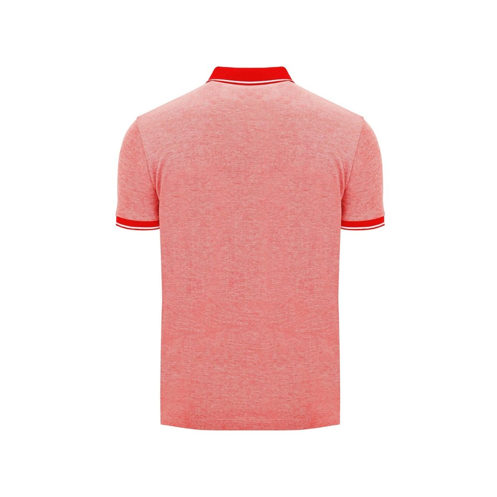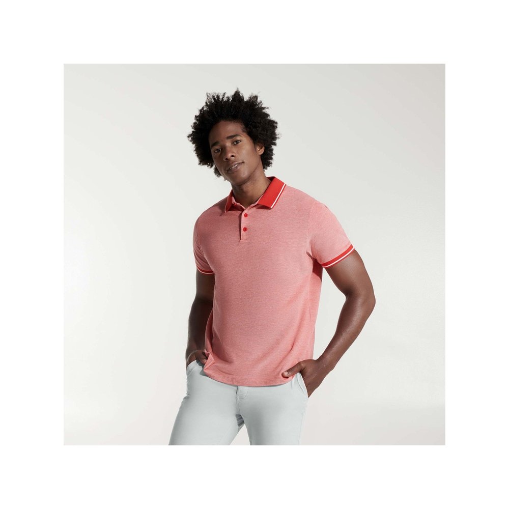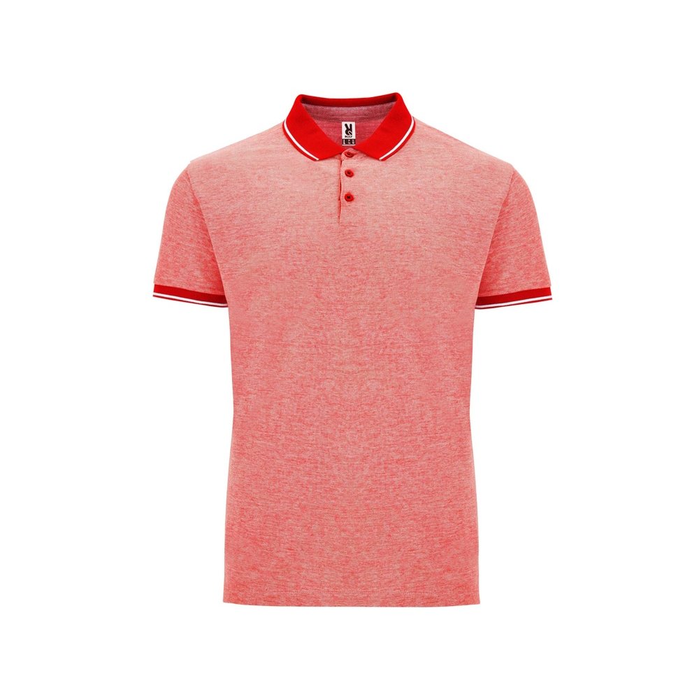 - Рубашка поло с коротким рукавом. Манжеты и воротник из однотонного риба 1х1 с контрастными полосками. Планка на 3 пуговицы. Низ с боковыми разрезами, отделанными тесьмой. Спинка немного длиннее полочки. Полотно с меланжевым эффектом.