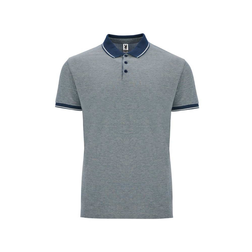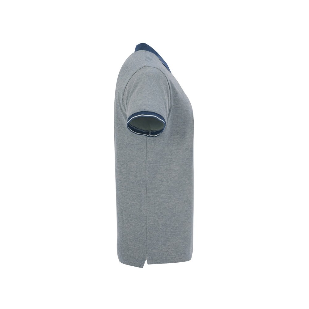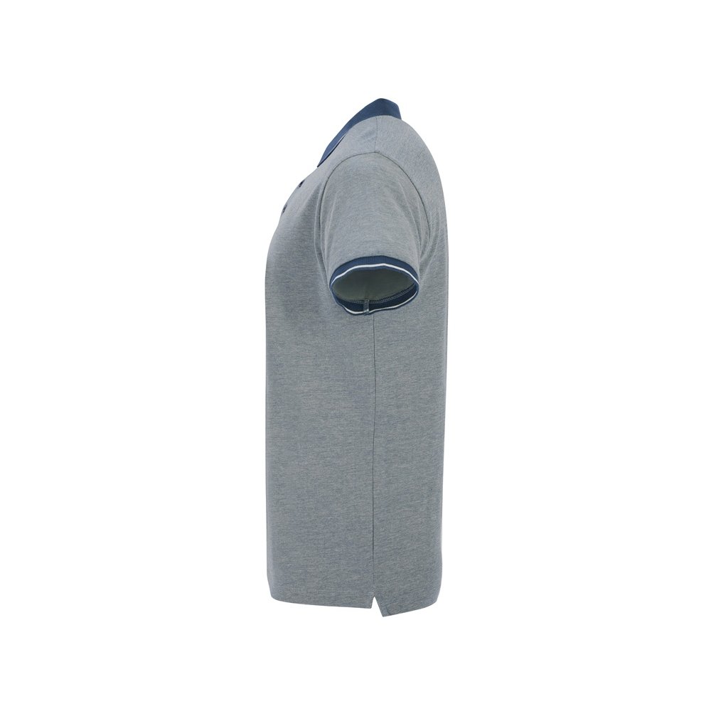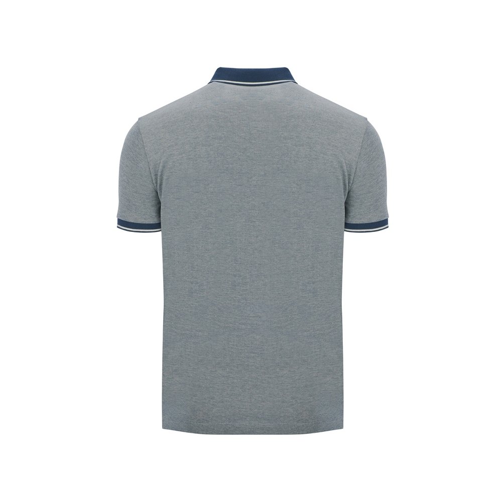 - Рубашка поло с коротким рукавом. Манжеты и воротник из однотонного риба 1х1 с контрастными полосками. Планка на 3 пуговицы. Низ с боковыми разрезами, отделанными тесьмой. Спинка немного длиннее полочки. Полотно с меланжевым эффектом.