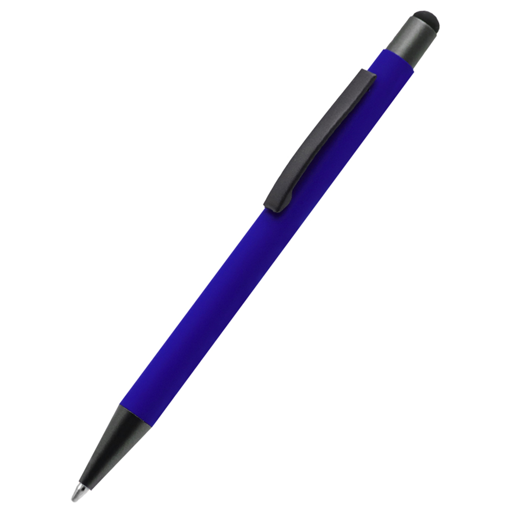 - Бархатистая на ощупь ручка Story сотф-тач сделана из металла. Синие чернила, имеет стилус для взаимодействия с портативными устройствами. Толщина пишущего узла 1 мм, длина письма рассчитана на 700 м. Цвет по PANTONE® (максимально приближен): 7687 C.