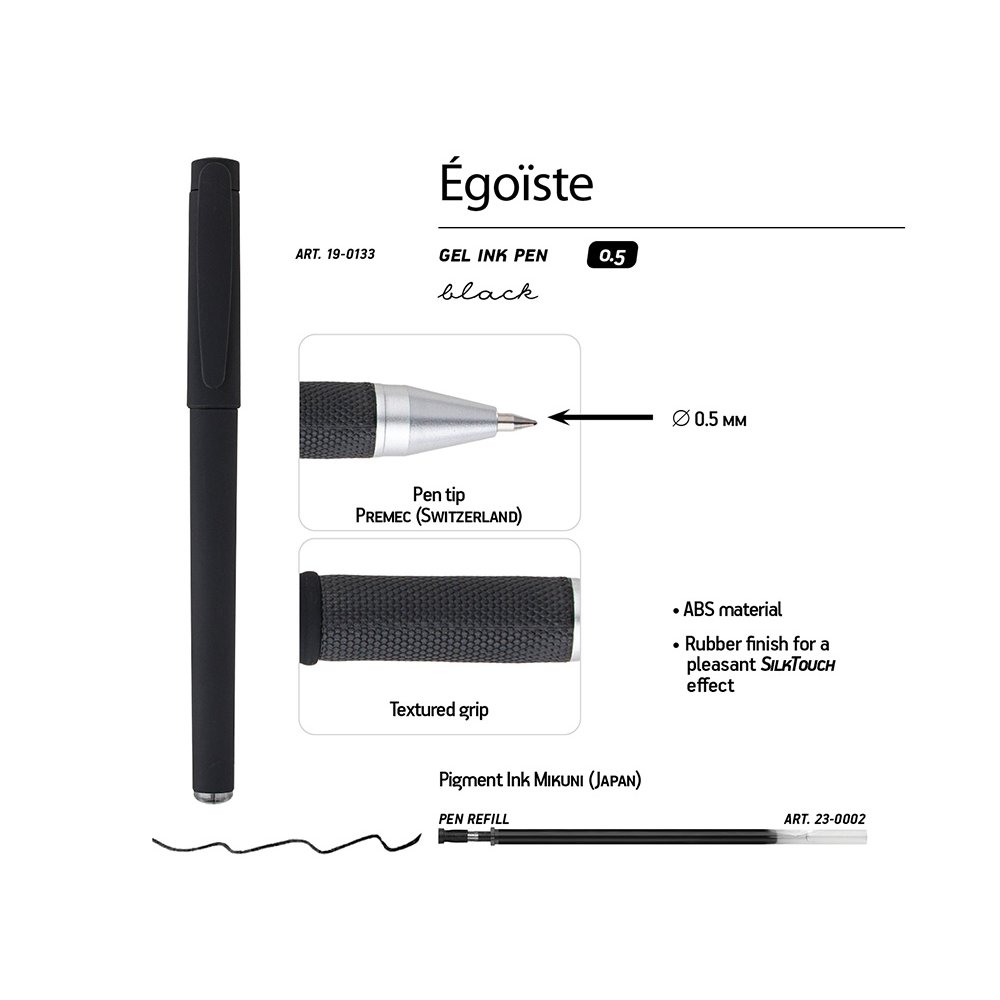 - Линия гелевых ручек Egoiste выпускается в эргономичных округлых корпусах утолщенного диаметра. Современное антискользящее покрытие черного корпуса на ощупь напоминает прорезиненные поверхности или карбон. Повышенная прочность достигается за счет металлизированного наконечника, в котором закреплен пишущий узел Premec (Швейцария) толщиной 0,5 мм. В стержнях использованы японские чернила Mikuni черного цвета.
