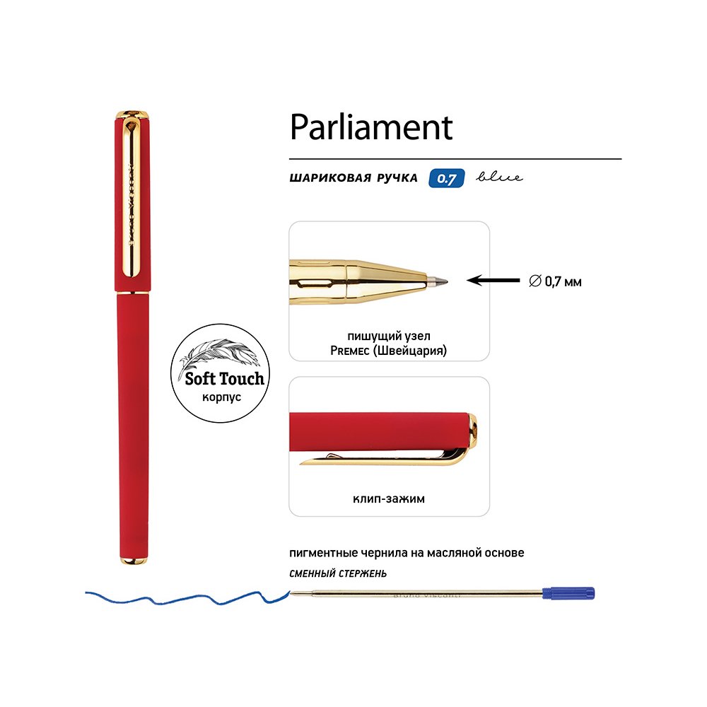 - Ручка "Parliament" с чернилами на масляной основе синего цвета отличается мягким письмом и толщиной линии 0,5 мм. Ее прорезиненный корпус soft-touch обеспечивает комфорт при длительном использовании, а отвинчивающийся наконечник облегчает доступ к сменному стержню. Колпачок с клип-зажимом обеспечивает удобное крепление ручки на одежде или сумке. Качество письма обеспечивается премиальным швейцарским пишущим узлом диаметром 0,7 мм от производителя Premec и немецкими чернилами марки Dokumental. Ручка упакована в индивидуальную подарочную упаковку.