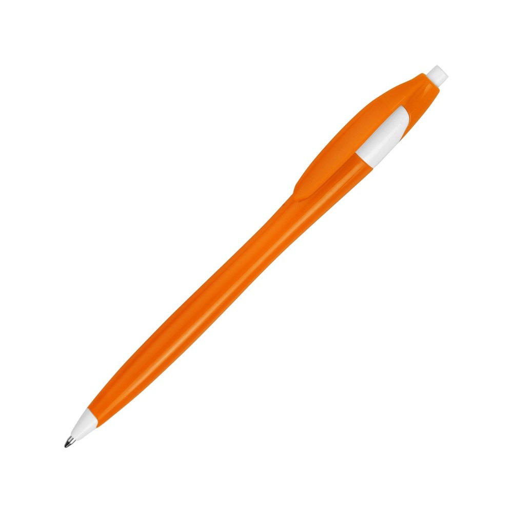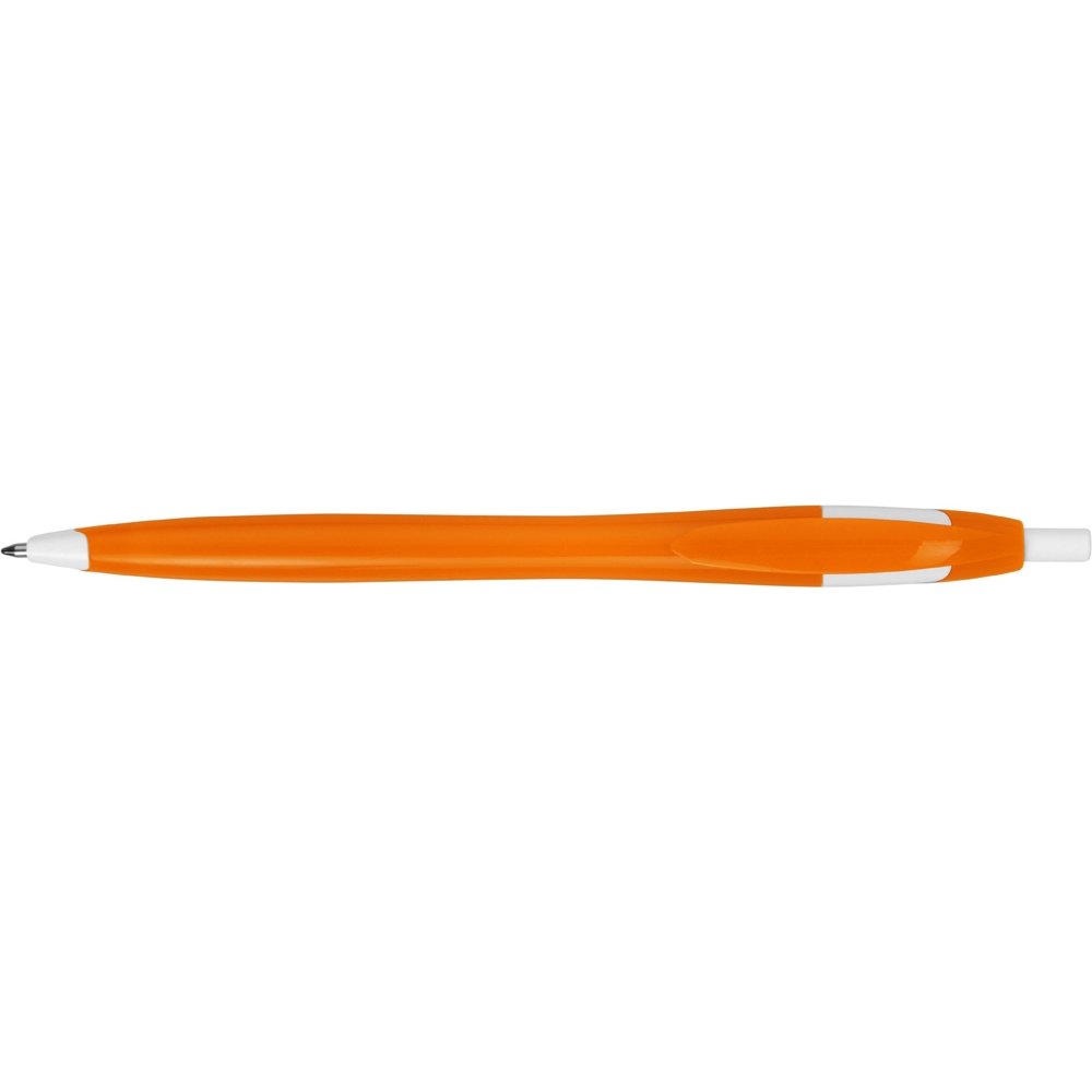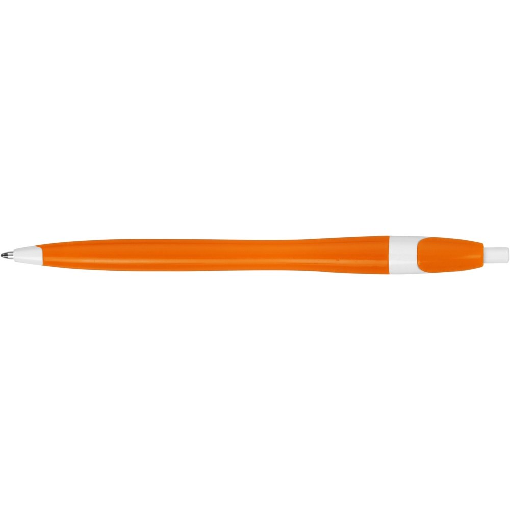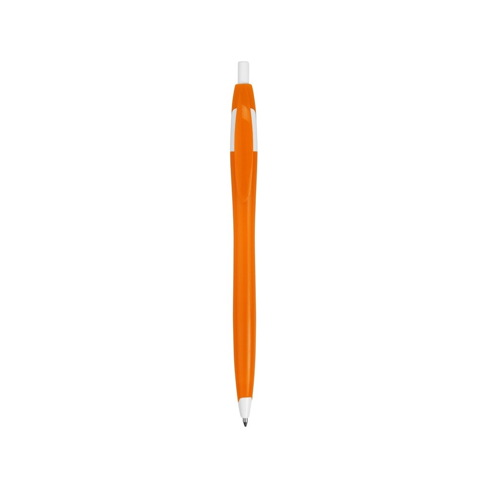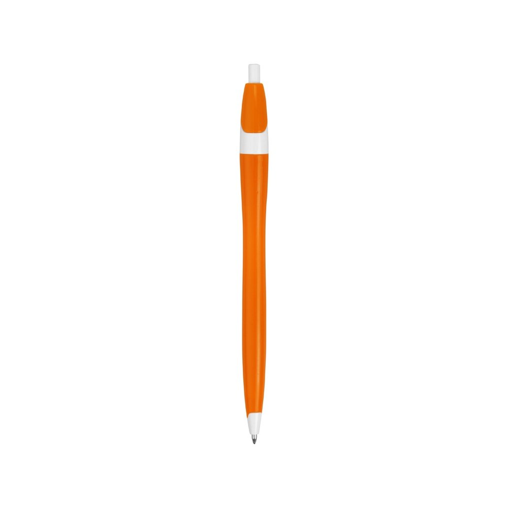 - Простая, но стильная пластиковая ручка с цветным корпусом и белыми вставками на носике, кнопке и под клипом. Белые вставки делают ручку более заметной, не отвлекая от рекламной информации на ее корпусе.