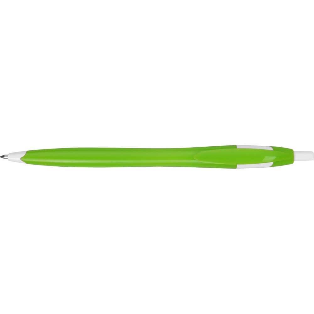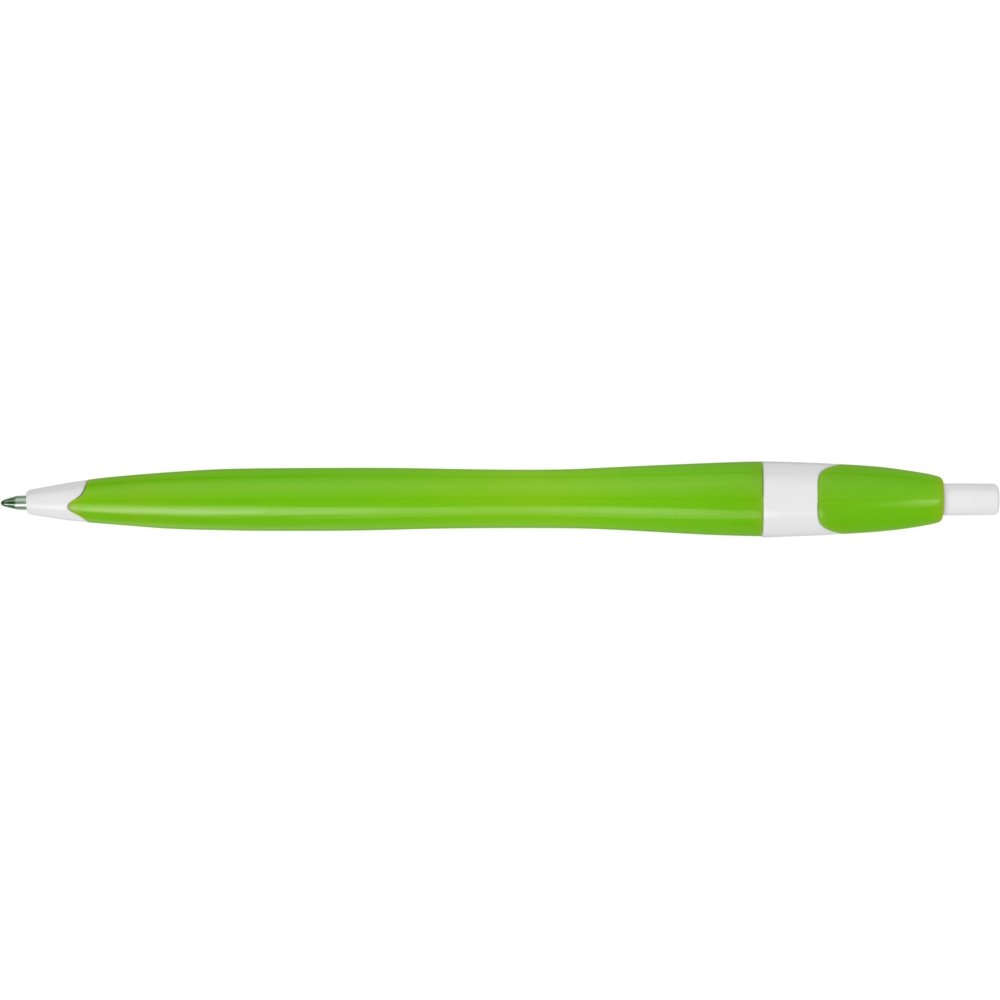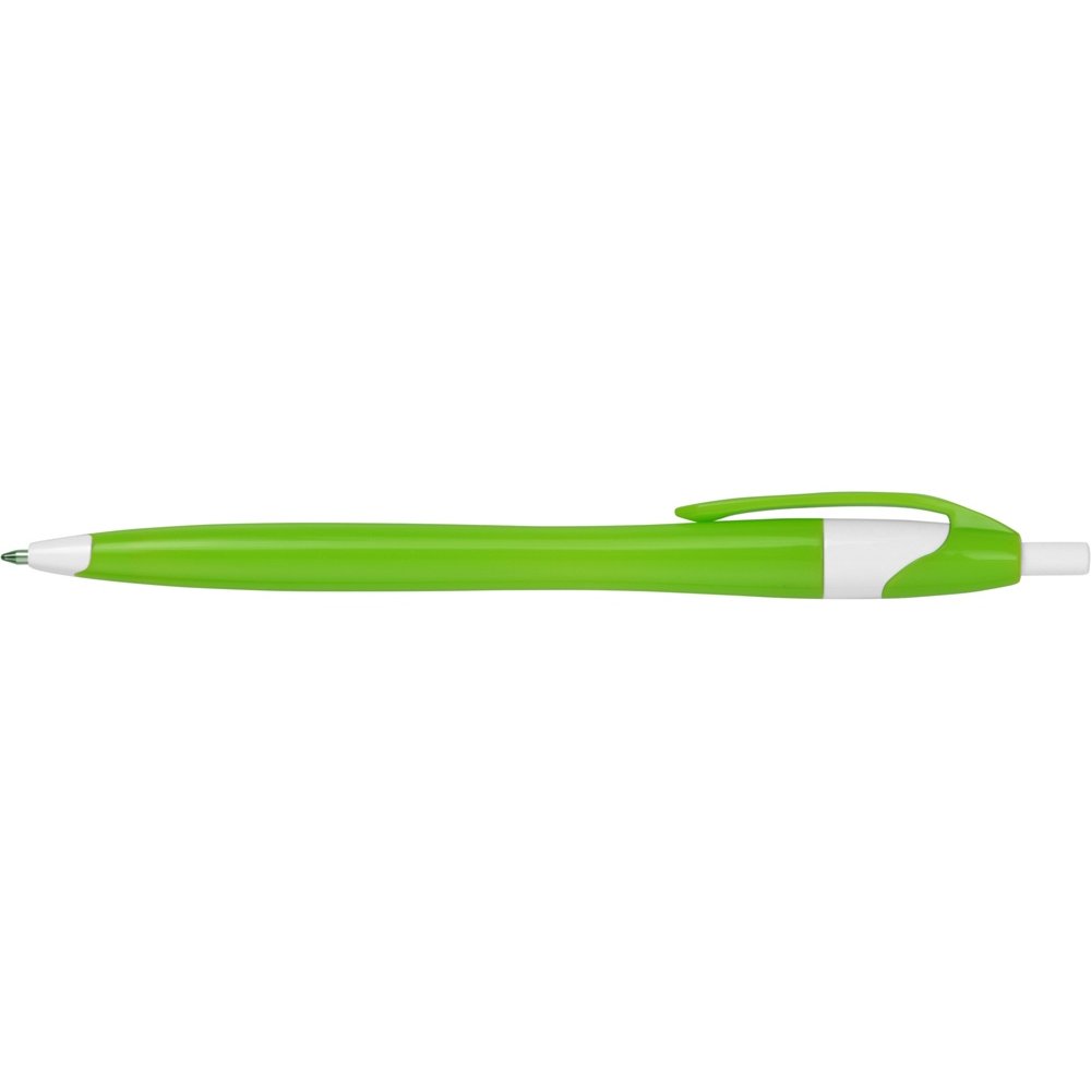 - Простая, но стильная пластиковая ручка с цветным корпусом и белыми вставками на носике, кнопке и под клипом. Белые вставки делают ручку более заметной, не отвлекая от рекламной информации на ее корпусе.