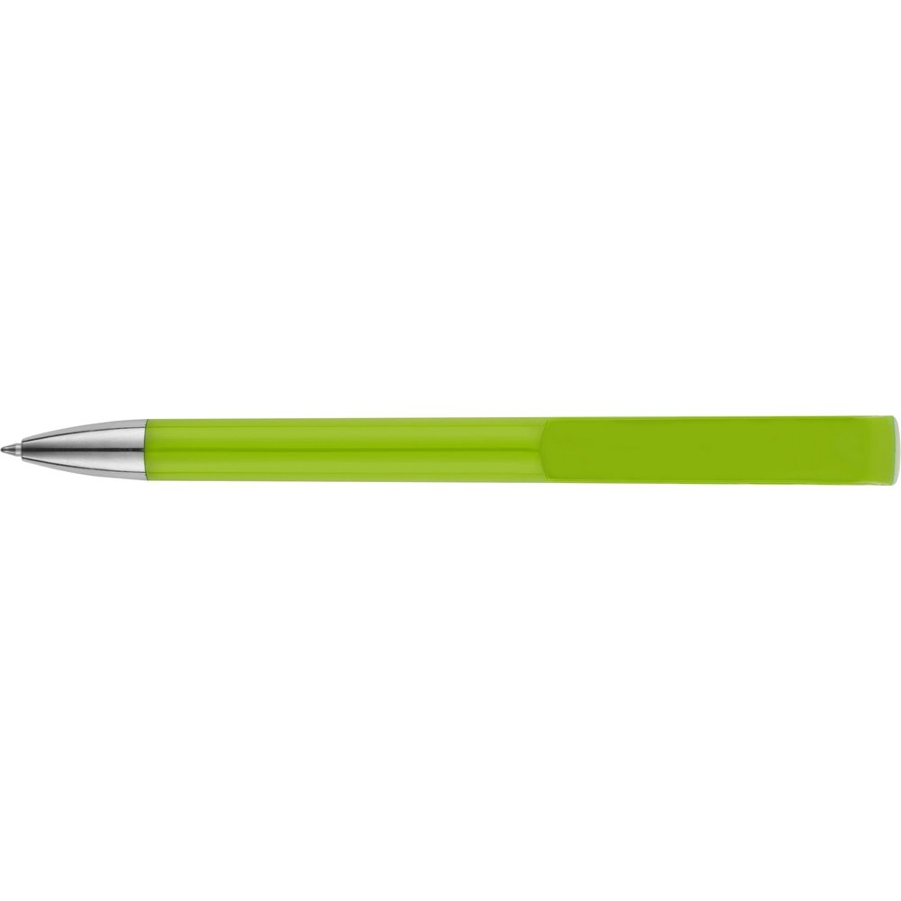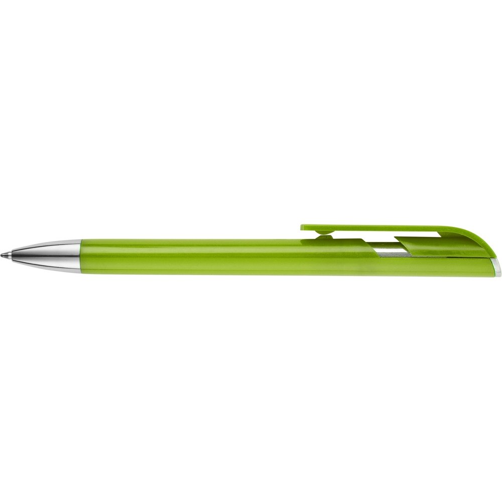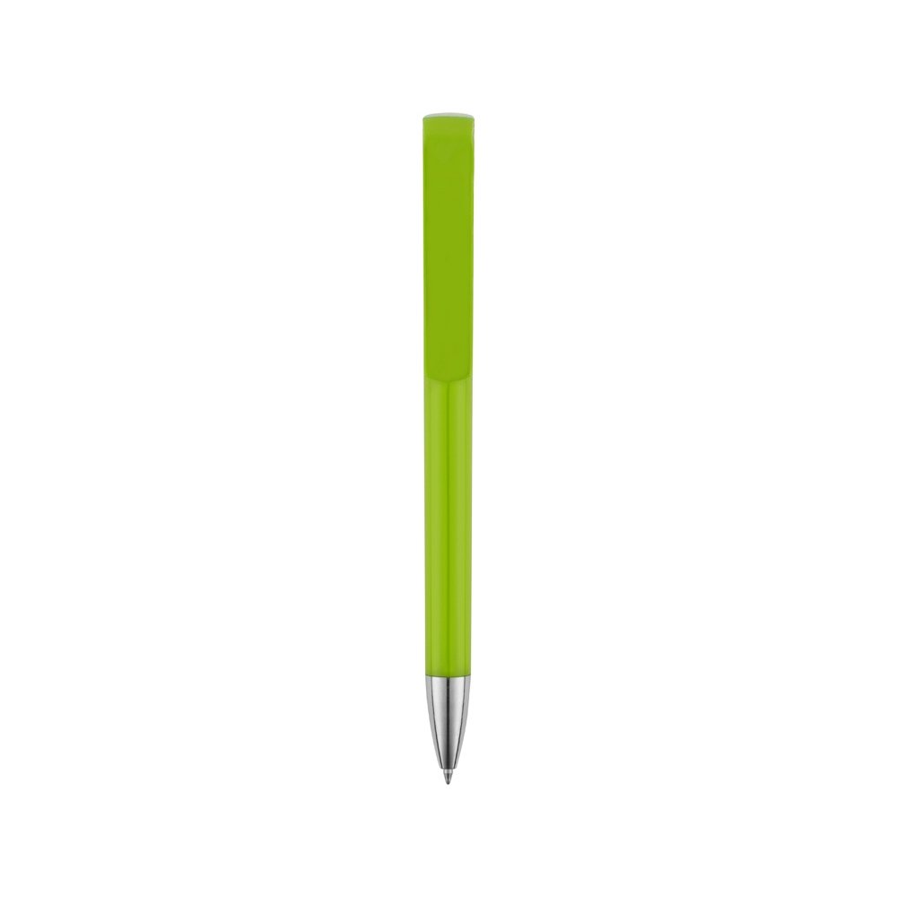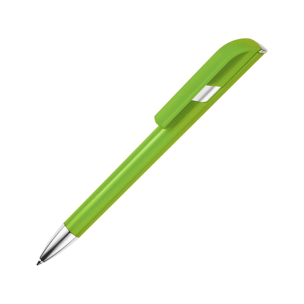 - Пластиковая ручка с цветным корпусом и серебристым носиком привлечет внимание своим необычным дизайном: при нажатии на кнопку двигается только часть клипа, а вторая – остается на месте. Из шести расцветок можно выбрать ту, что наилучшим образом подойдет к вашим фирменным цветам.