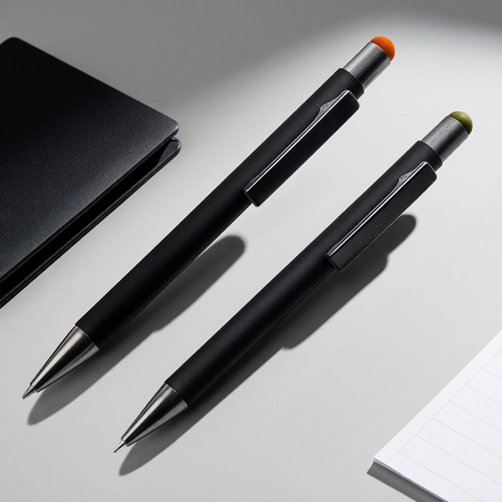 - В черном-черном городе, на черной-черной улице жила черная, но очень стильная ручка FACTOR BLACK. Немецкие чернила и шарик из карбида вольфрама обеспечат гладкое письмо без особого нажима. Приятный на ощупь бархатистый корпус с покрытием soft touch и яркий контрастный стилус на торце обязательно обратят на себя внимание. На ручке возможна двухцветная 3D-гравировка. Эта красавица точно не останется незамеченной, особенно если ее персонализировать! • Pantone, близкий к 1585 C• Размер 140*10 мм• Корпус из алюминия с покрытием soft touch• Зеркальная подложка в цвет стилуса• Яркий стилус. Pantone, близкий к 200 С• Металлический клип-прищепка черного цвета• Носик и кнопка из пластика• Нажимной механизм подачи стержня• Пулевидный пишущий узел 1.0 мм• Длина линии письма 1000 м • Чернила Dokumental. Цвет чернил синий• Сменный стержень Parker type