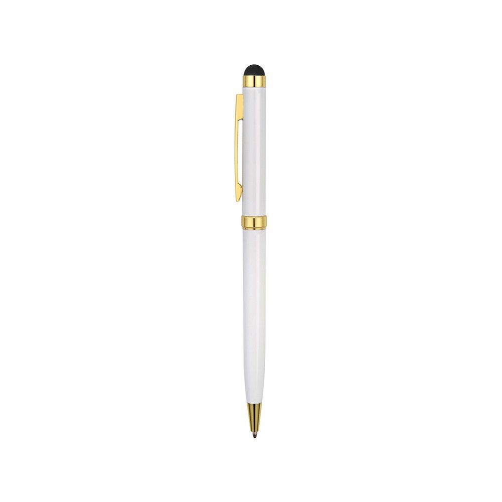 - Стильная металлическая ручка со стилусом «Голд Сойер» – по-настоящему универсальный пишущий инструмент. Ею можно делать записи на бумаге, а перевернув, работать с емкостными экранами с помощью стилуса. Элегантность ручки подчеркивают позолоченные детали: клип, носик и кольцо.