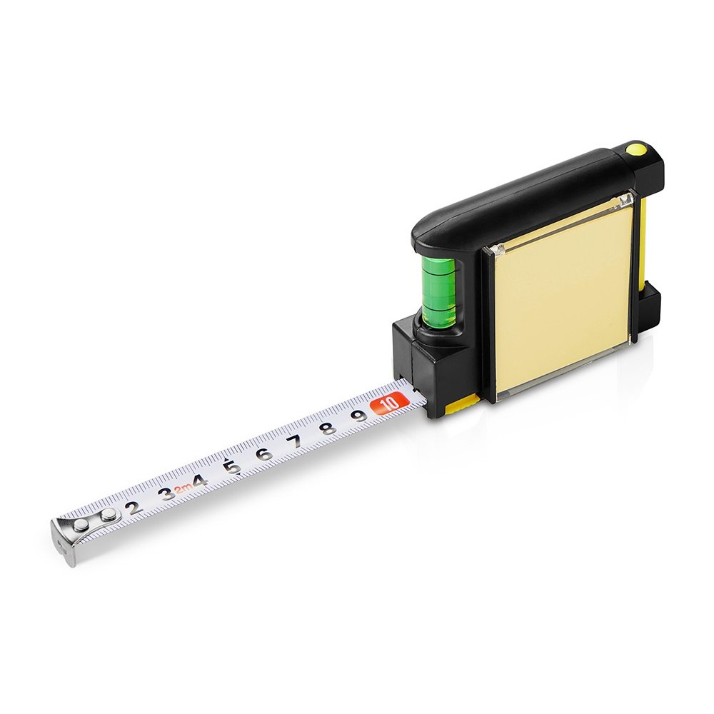 - Компактная рулетка на 2 м с полезными функциями: - Блокнот и ручка для записей - Уровень - Клип для крепления к ремню