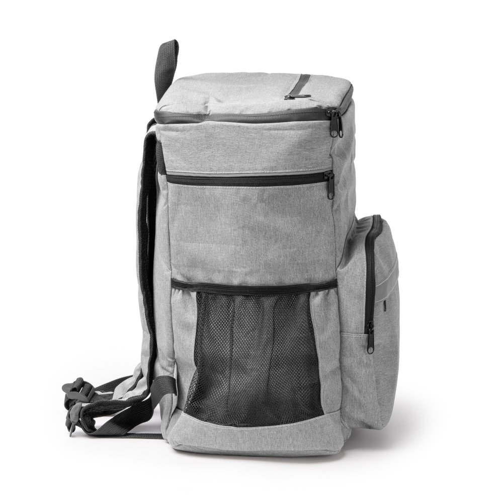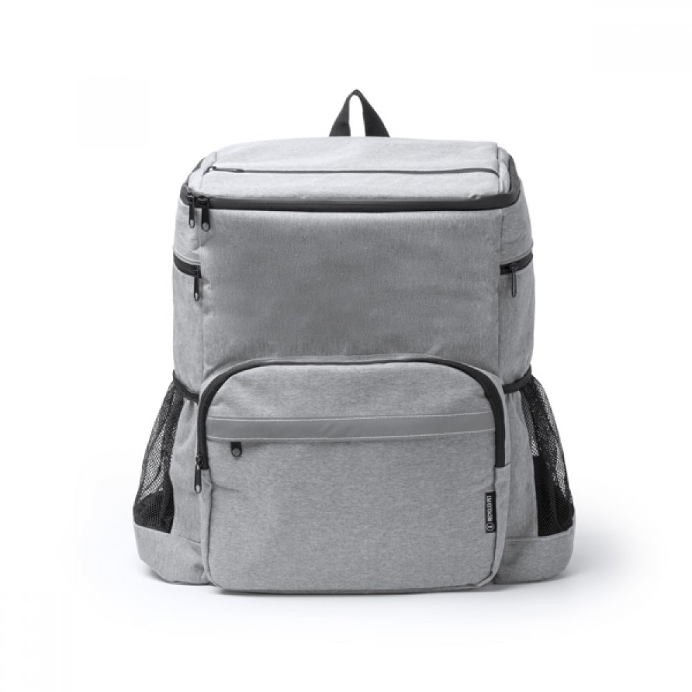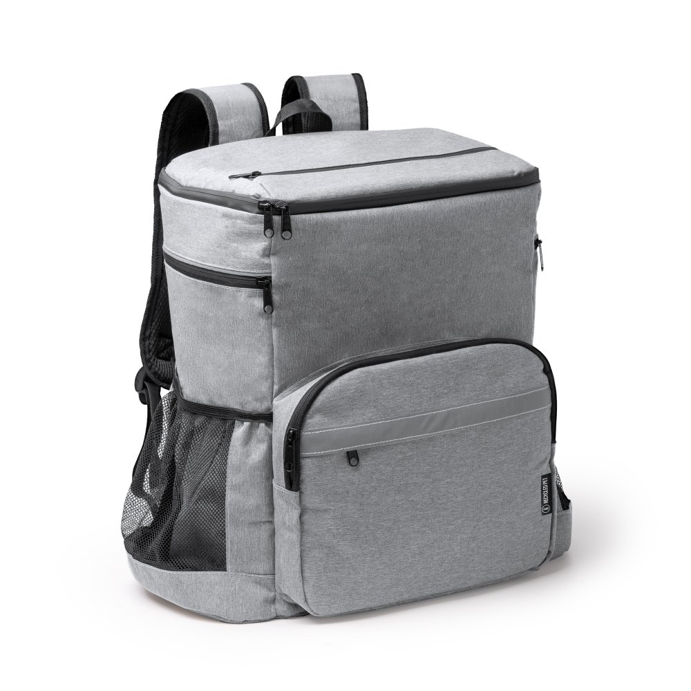 - Рюкзак-холодильник из 600D RPET. Основной отсек и верхний карман с изотермической внутренней частью, которая помогает поддерживать оптимальную температуру пищи и позволяет хранить меньшие закуски. Кроме того, эти отсеки оснащены водонепроницаемыми застежками-молниями, что позволяет хранить содержимое более надежно и обеспечивает лучшую защиту от воды и влаги. Передний внешний карман на застежке-молнии со светоотражающей полосой для улучшения видимости. Два боковых отсека с застежкой-молнией и два дополнительных сетчатых отсека для переноски других предметов, таких как бутылки. Мягкие ручки и спинка.