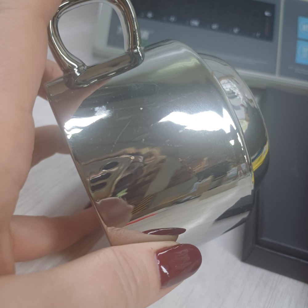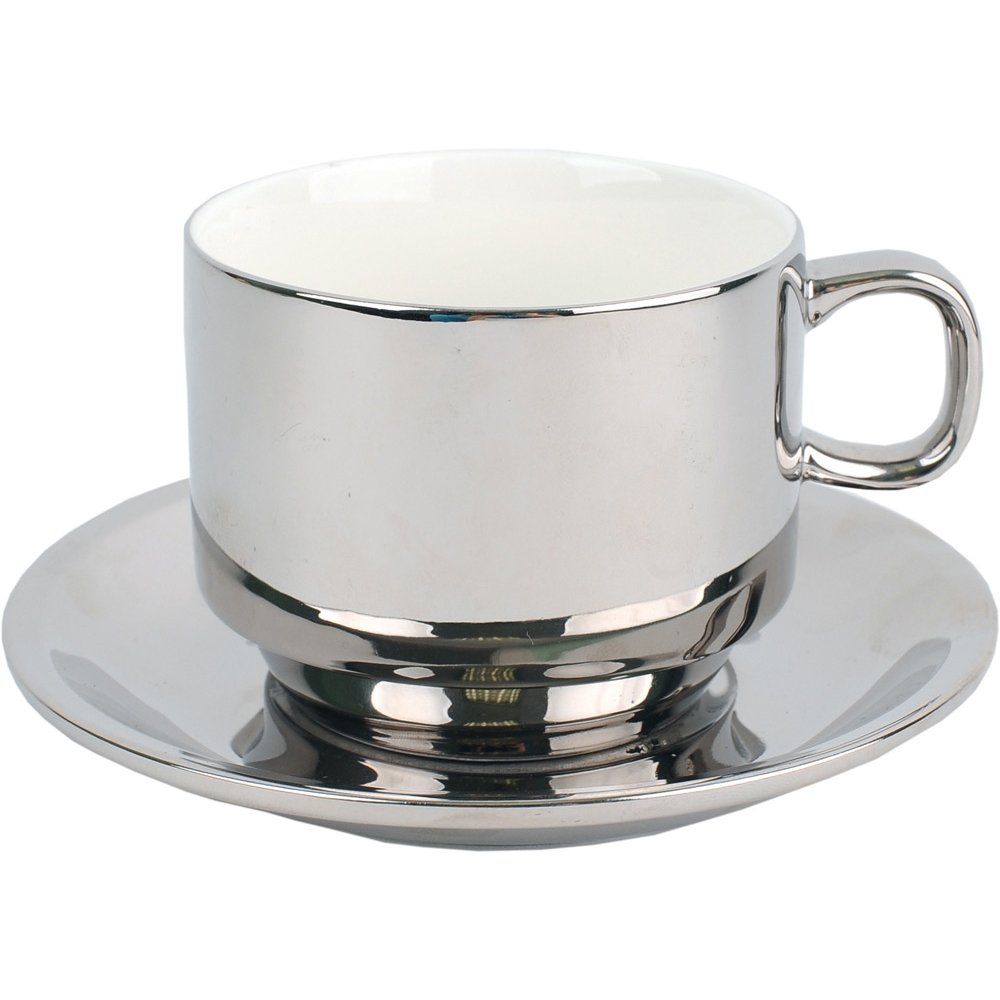- Роскошная чайная пара – отличный подарок для любителей чая. В наборе фарфоровые чашка и блюдце. Дизайн построен на сочетании жемчужного и серебристого цветов. Возможно нанесение тампопечати.