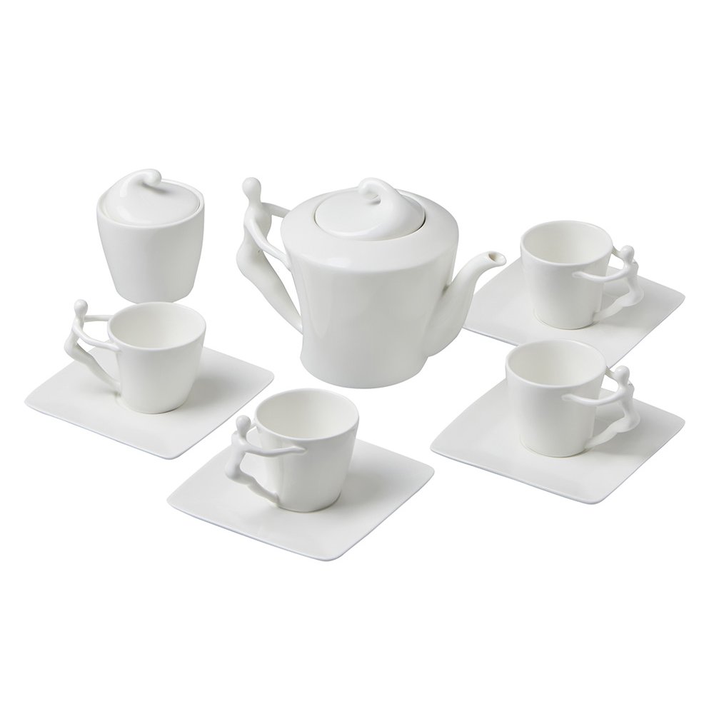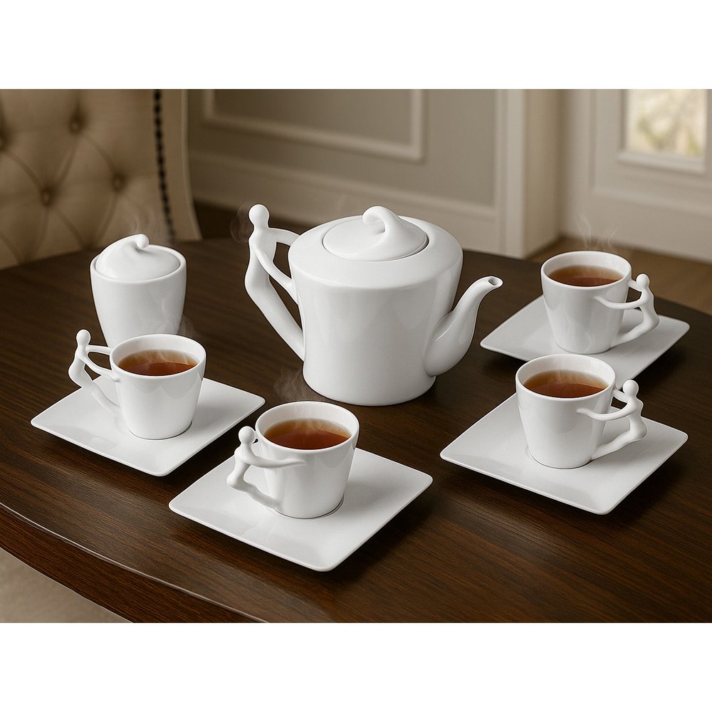 - Это не просто посуда, а настоящее произведение искусства для вашего стола. Белоснежный сервиз создан для тех, кто ценит не только вкус, но и эстетику каждого момента. Уникальный дизайн: Ручки чашек и чайника выполнены в виде стилизованной фигуры человека. Это придает сервизу особый характер и глубину, превращая процесс чаепития в диалог с искусством. Полный комплект: В набор входит все необходимое: 4 чашки, 4 блюдца, чайник и сахарница. Эксклюзивная упаковка: Сервиз поставляется в деревянной коробке. Вы можете нанести на нее логотип или памятную надпись. Это готовая идея для безупречного корпоративного подарка. Универсальность и стиль: Белоснежный цвет и лаконичный дизайн делают сервиз уместным в любом интерьере — от классики до модерна.