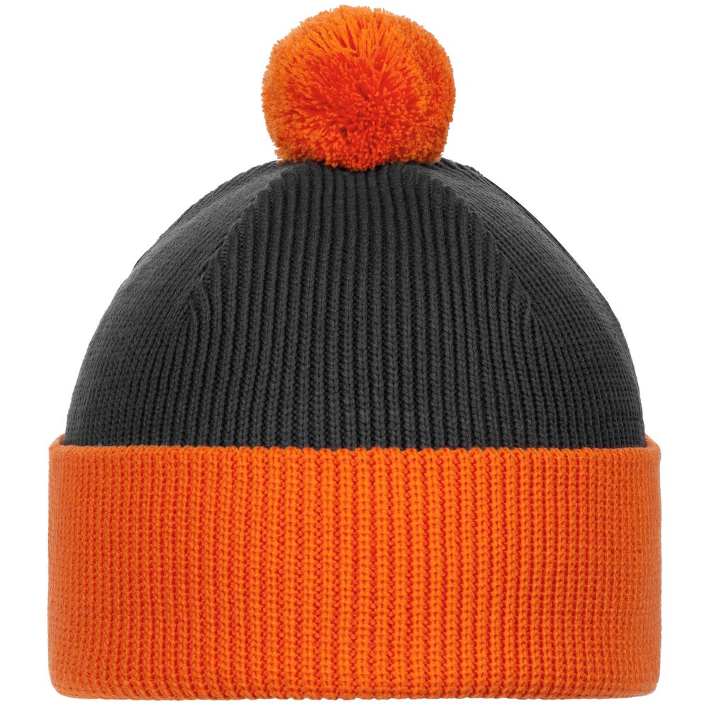 Двуслойная шапка фактурной вязки с контрастным подворотом и помпоном.