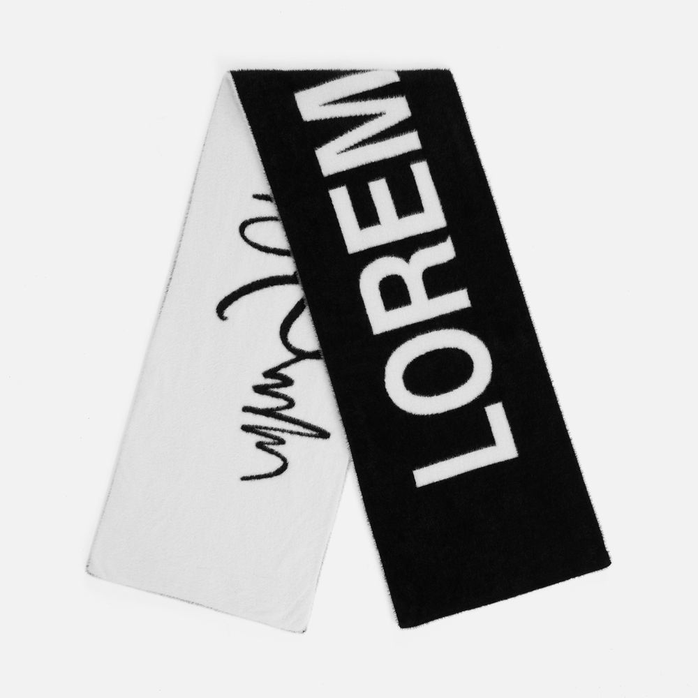 - Шарф из пушистого нейлона с вывязанным логотипом и индивидуальным рисунком в черно-белой гамме.