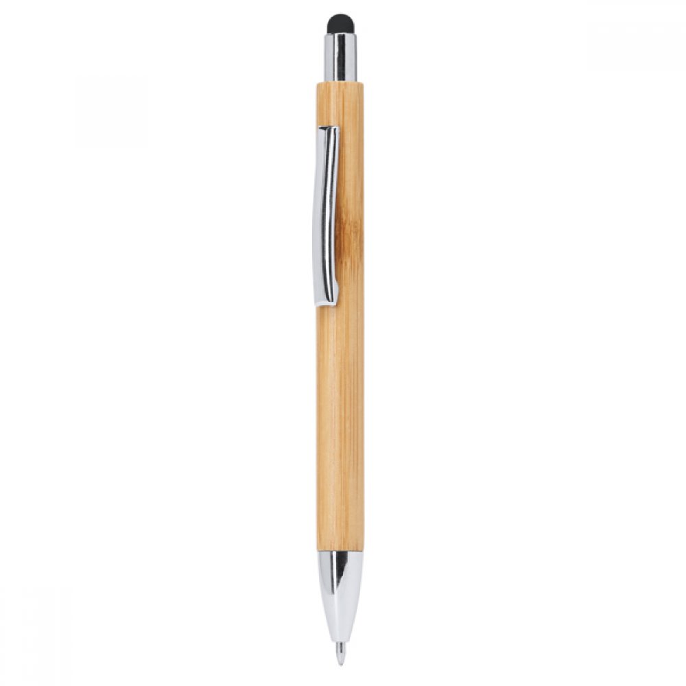 Шариковая ручка Eco line с бамбуковым корпусом, цветным указателем и металлическим клипсом. Серебристая кнопка, клип и наконечник. Прозрачная заправка jumbo диаметром 1,0 мм с синими чернилами.