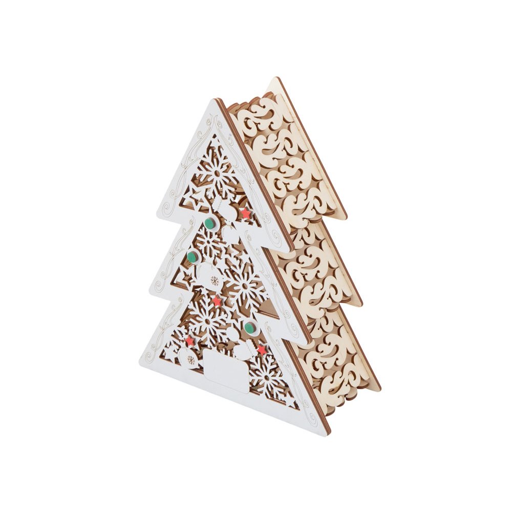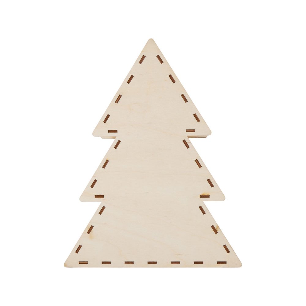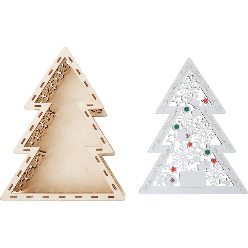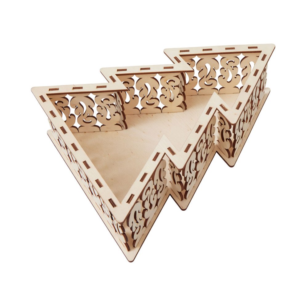 - Шкатулка из натуральной березовой фанеры в форме ёлки. Минималистичный дизайн и качественный материал делают её практичным и эстетичным аксессуаром. Подходит для хранения мелочей, украшений или как упаковка для небольших подарков. Идеальный вариант корпоративного сувенира, который подчёркивает внимание к деталям.