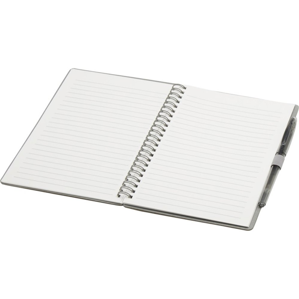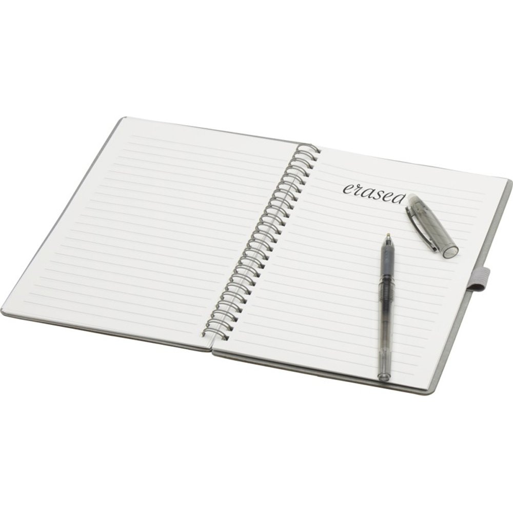 - Многоразовый набор из ручки и блокнота в мягкой обложке из каменной бумаги. Блокнот имеет обложку из картона, закругленные углы и 32 листа линованной бумаги плотностью 120 г/м². В производстве каменной бумаги не используется дерево, а на сам процесс изготовления затрачивается гораздо меньше энергии в сравнении с производством переработанной или целлюлозной бумаги. Сзади имеется карман для хранения черной протирочной ткани (входит в комплект). Ручка из переработанного пластика с стираемыми чернилами, прозрачным корпусом, белым ластиком сверху и однотонной цветной рукояткой. Цвет чернил: черный. Длина непрерывной линии: 250 метров. Размер пера: 0,7 мм.