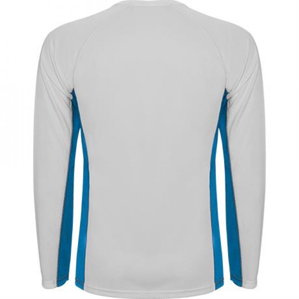 - Спортивная футболка из двух комбинированных тканей из полиэстера. Длинные рукава реглан. Основная ткань — bird's eye, а боковые вставки и рукава с внутренней стороны — с микроперфорированной ткани. Круглая горловина с усиленными закрытыми внутренними швам