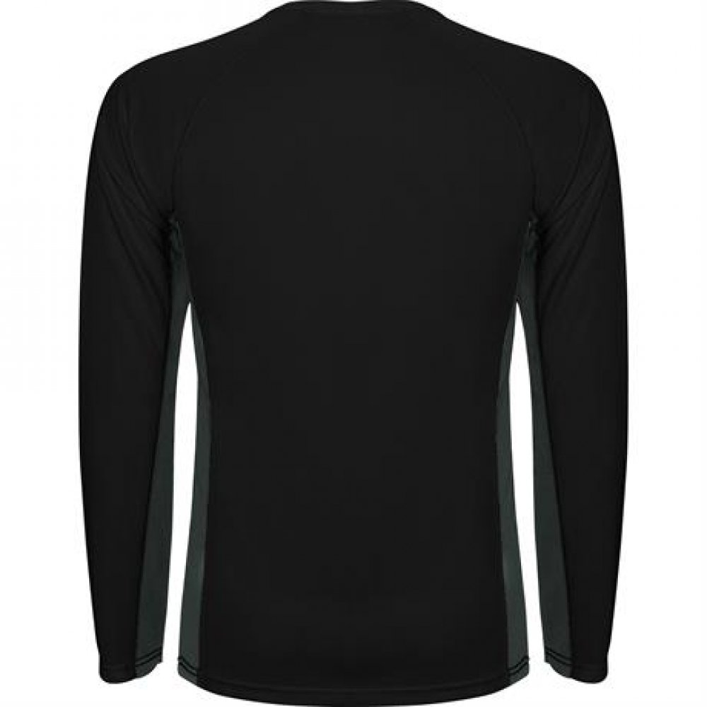 - Спортивная футболка из двух комбинированных тканей из полиэстера. Длинные рукава реглан. Основная ткань — bird's eye, а боковые вставки и рукава с внутренней стороны — с микроперфорированной ткани. Круглая горловина с усиленными закрытыми внутренними швам