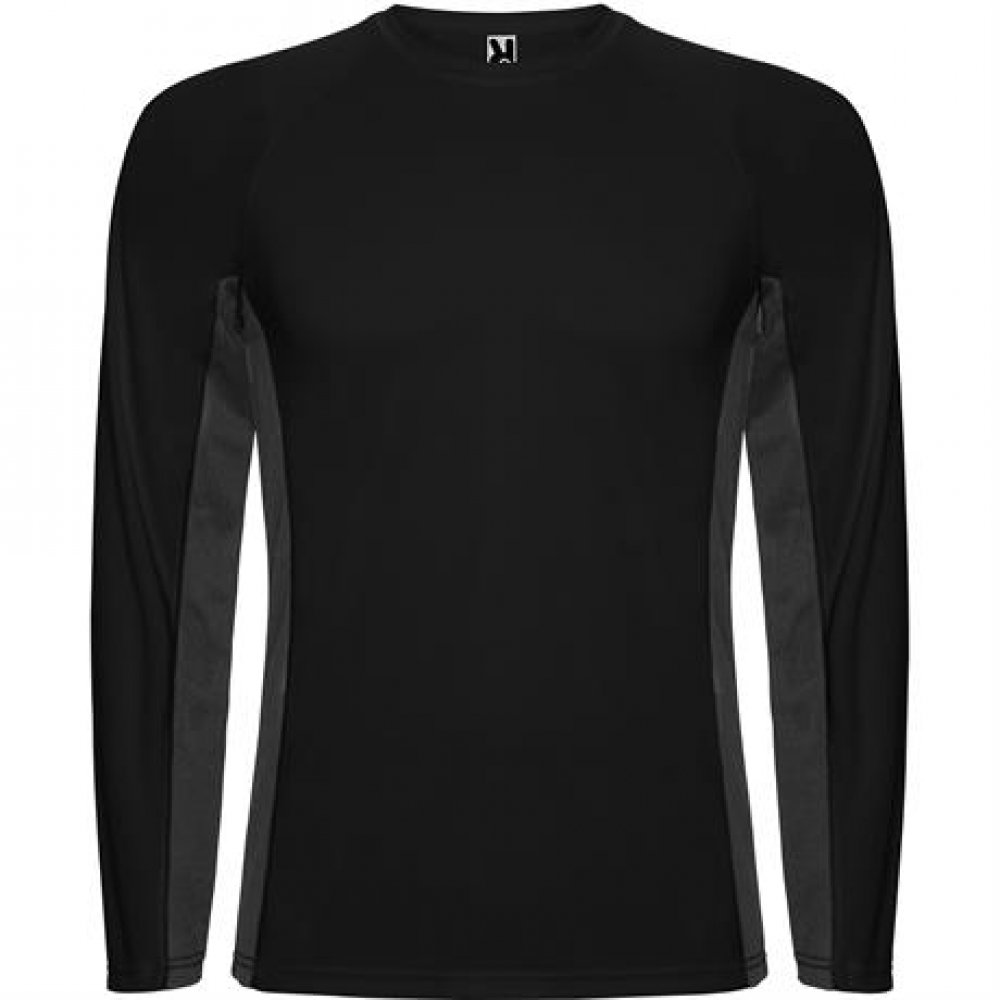 - Спортивная футболка из двух комбинированных тканей из полиэстера. Длинные рукава реглан. Основная ткань — bird's eye, а боковые вставки и рукава с внутренней стороны — с микроперфорированной ткани. Круглая горловина с усиленными закрытыми внутренними швам