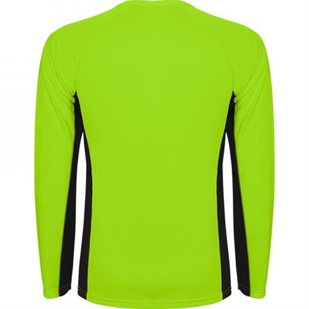 - Спортивная футболка из двух комбинированных тканей из полиэстера. Длинные рукава реглан. Основная ткань — bird's eye, а боковые вставки и рукава с внутренней стороны — с микроперфорированной ткани. Круглая горловина с усиленными закрытыми внутренними швам