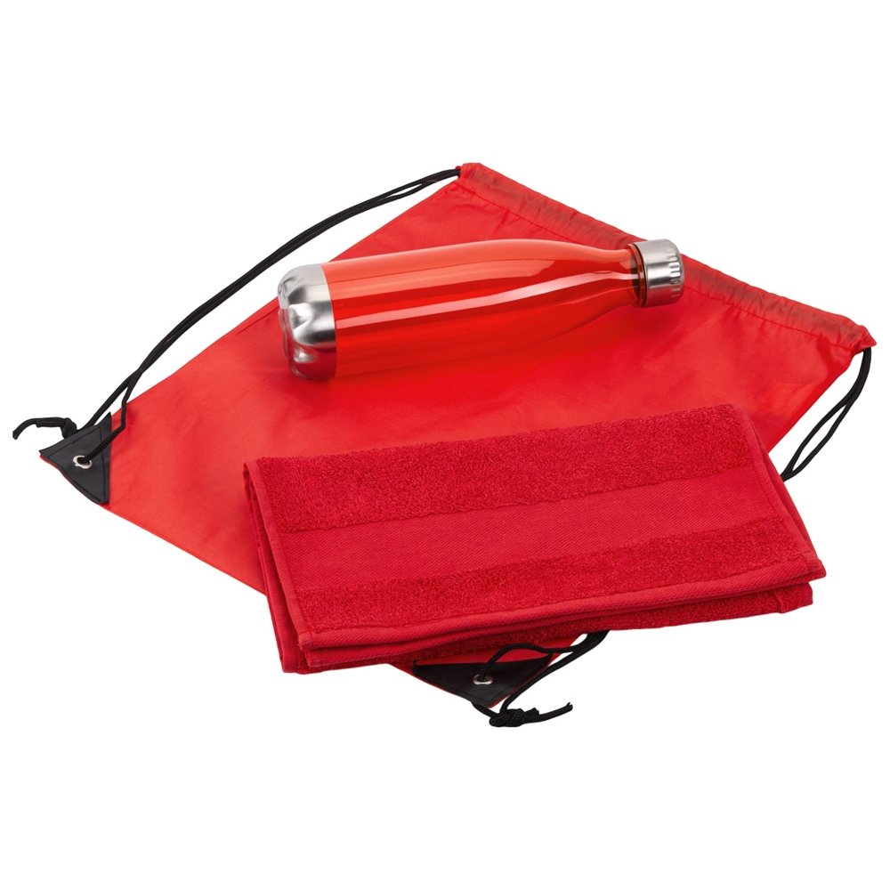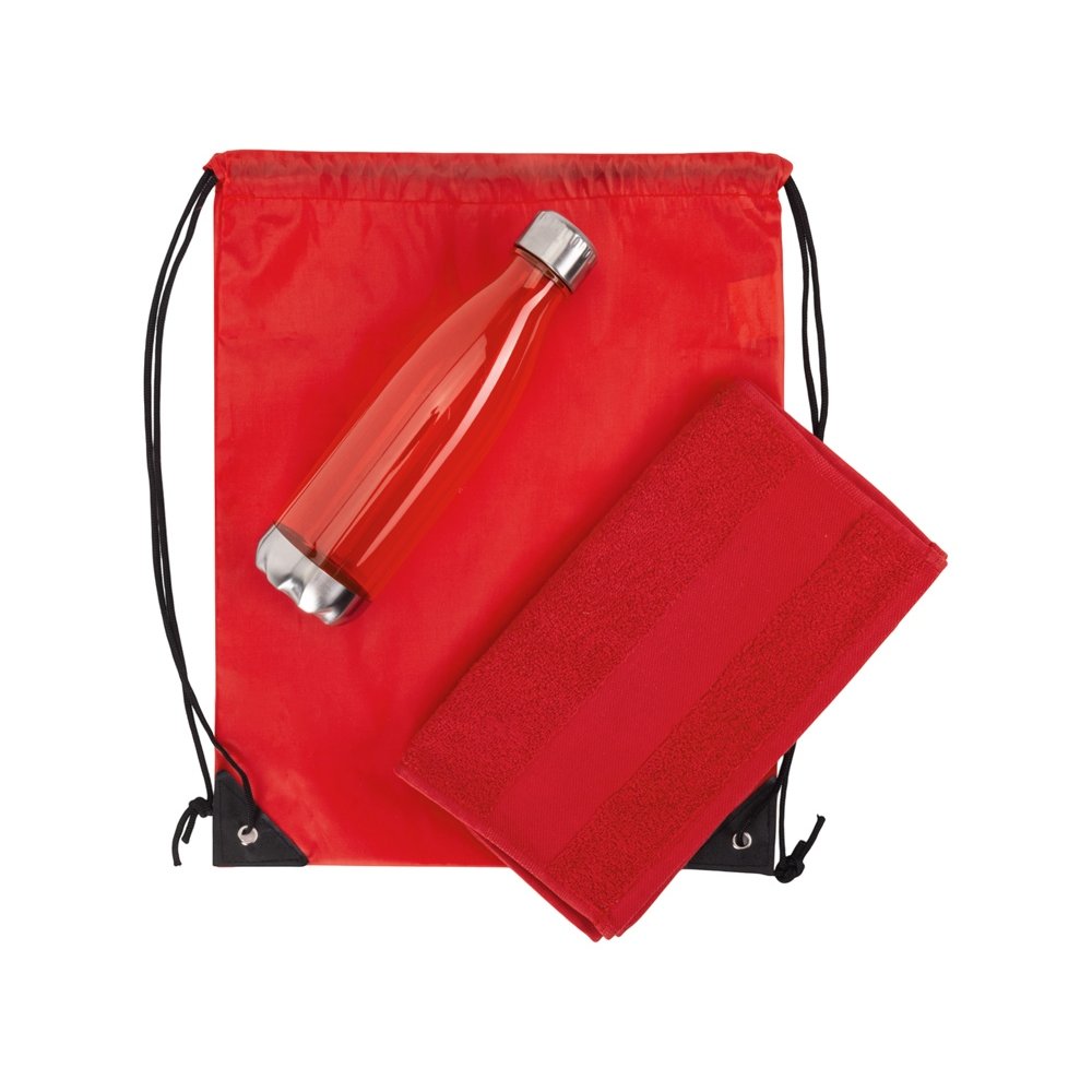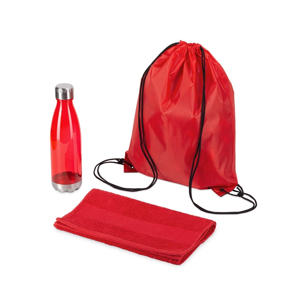 - Универсальный спортивный набор будет актуален в любом виде спорта. Бутылка для воды позволит брать с собой не только воду, но и тонизирующие напитки или коктейли и поможет освежиться в любой момент. Тритан, из которого изготовлена бутылка, не искажает вкус и запах напитков, являясь абсолютно безопасным для человека. Натуральное полотенце из 100% хлопка не вызовет аллергии и не навредит коже. Вместительный рюкзак пригодится, чтобы всегда держать под рукой всё необходимое для тренировки. • объём бутылки: 700 мл • размер полотенца: 30х70 см • практичный набор для спортивного мерча