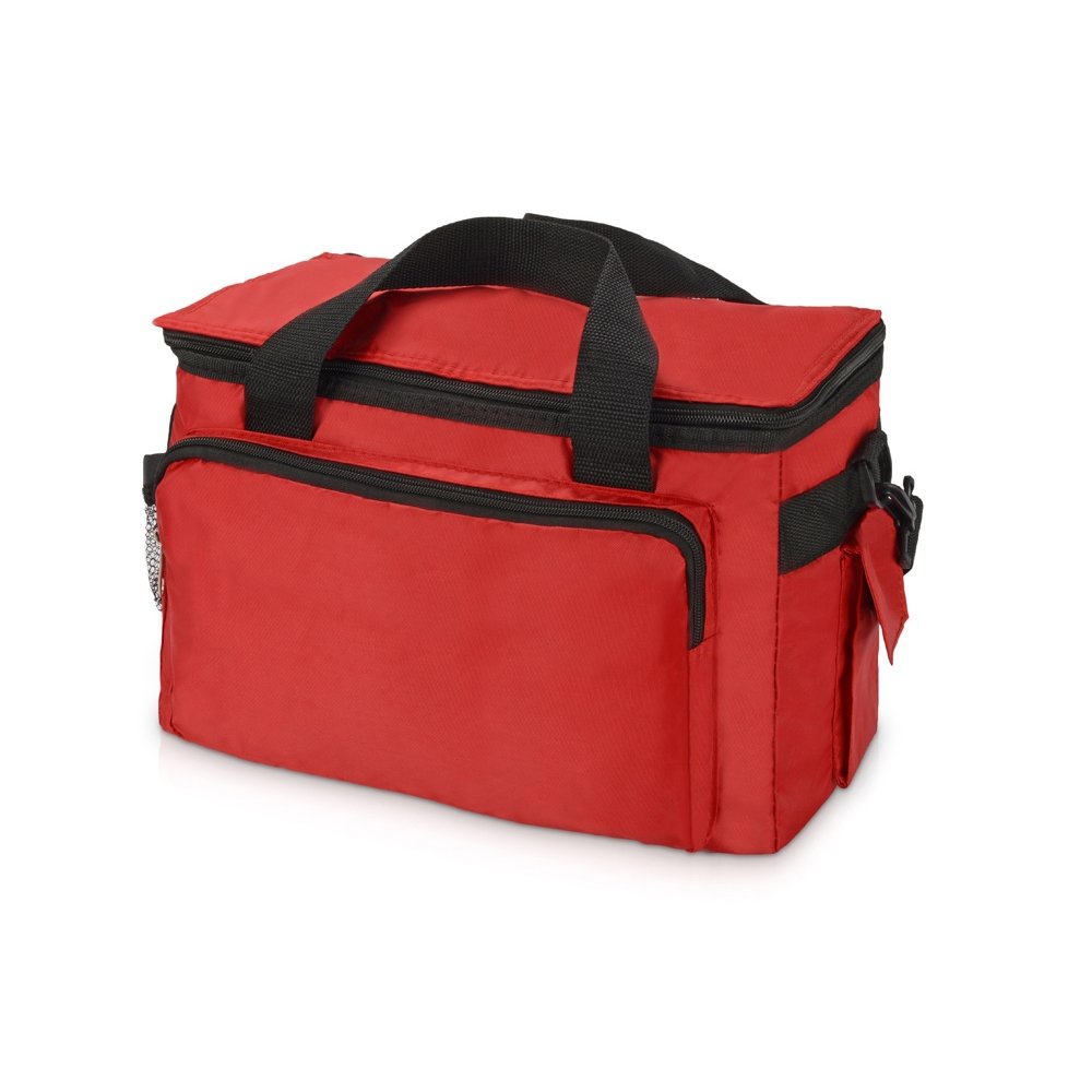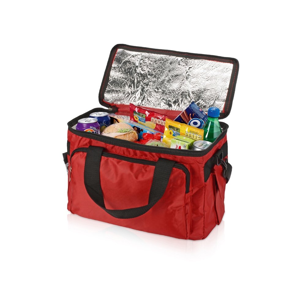 - Вместительная сумка-холодильник (объем – 15 л.) «Камайоре» прекрасно подойдет не только для индивидуальных пикников, но даже и для доставки горячих продуктов (пиццы, например). С боков 2 кармана – один сетчатый с регулируемой затяжкой для бутылки. Другой для приборов, салфеток или других мелочей закрывается на липучку. Наружный слой сделан из полиэстера, на него может быть нанесена персонализация: имя владельца или логотип компании.
