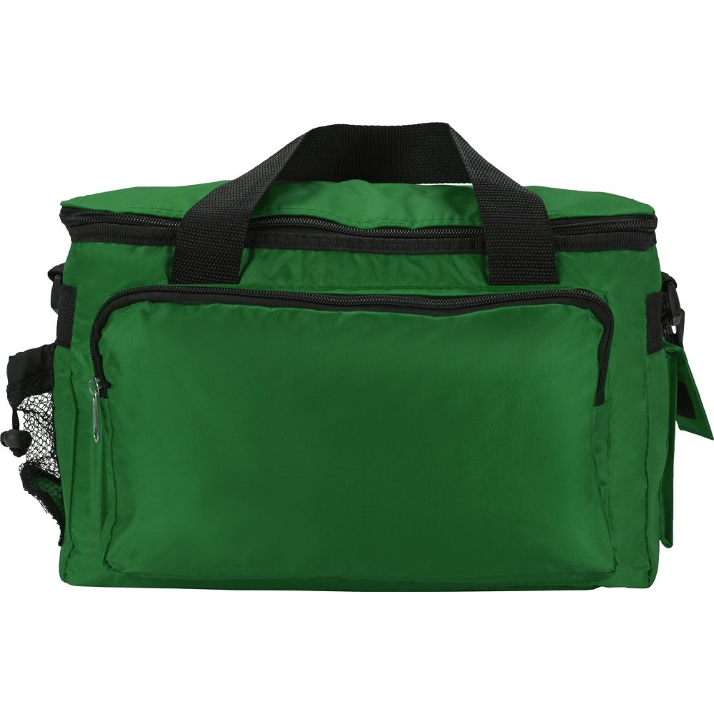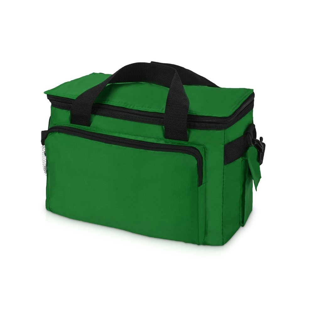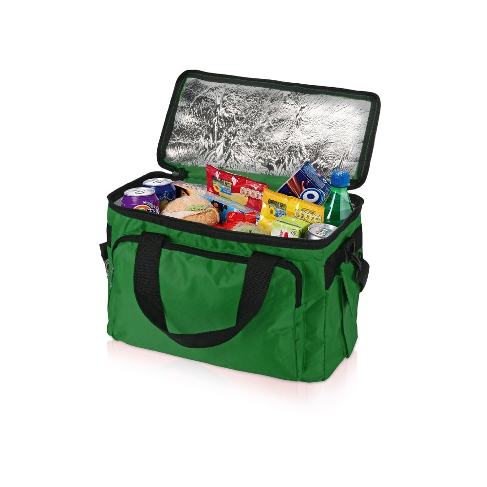 - Вместительная сумка-холодильник (объем – 15 л.) «Камайоре» прекрасно подойдет не только для индивидуальных пикников, но даже и для доставки горячих продуктов (пиццы, например). С боков 2 кармана – один сетчатый с регулируемой затяжкой для бутылки. Другой для приборов, салфеток или других мелочей закрывается на липучку. Наружный слой сделан из полиэстера, на него может быть нанесена персонализация: имя владельца или логотип компании.