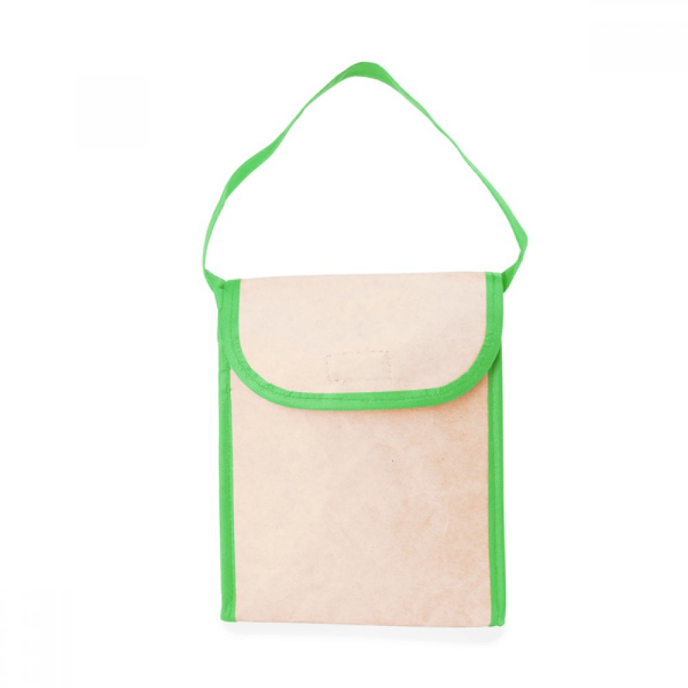 Сумка-холодильник из ламинированной бумаги с алюминиевой изотермической подкладкой и 2 мм изоляционной пеной. Ручка 60 см и клапан с застежкой-липучкой. Сумка и ручка имеют отделку соответствующего цвета.