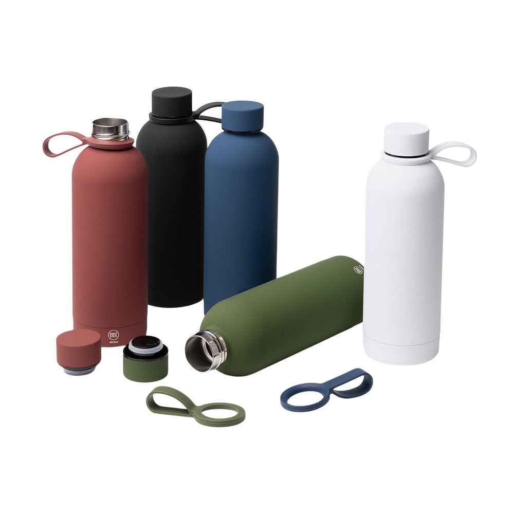 - Термобутылка из переработанной нержавеющей стали 304. Мягкая прорезиненная поверхность на корпусе. Удобная силиконовая ручка для переноски. Оснащена противокапельной системой благодаря силиконовому кольцу, встроенному во внутреннюю часть крышки. Крышка и ручка соответствуют цвету корпуса. Объем: 500 мл. - Переработанная нержавеющая сталь 304 - Защита от капель - Нельзя мыть в посудомоечной машине - Поставляется в эко коробке