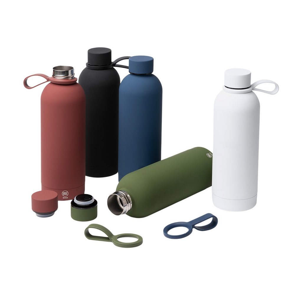 - Термобутылка из переработанной нержавеющей стали 304. Мягкая прорезиненная поверхность на корпусе. Удобная силиконовая ручка для переноски. Оснащена противокапельной системой благодаря силиконовому кольцу, встроенному во внутреннюю часть крышки. Крышка и ручка соответствуют цвету корпуса. Объем: 500 мл. - Переработанная нержавеющая сталь 304 - Защита от капель - Нельзя мыть в посудомоечной машине - Поставляется в эко коробке