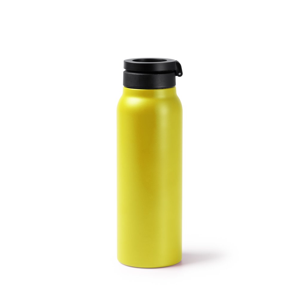 Бутылка-термос из переработанной нержавеющей стали с двойными стенками. Крышка с магнитным кольцом для держателя мобильного телефона. Со складной соломкой и нескользящей резиной на основании. Емкость: 750 мл.
