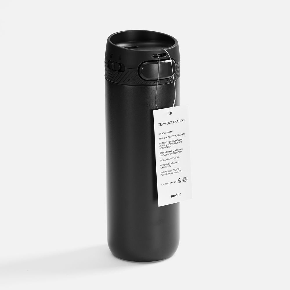 - Специально спроектированная конструкция термостакана Andor со съемной кнопкой и отверстием для подвеса на крышке открывает простор для различных вариантов кастомизации и нанесения изображений. На изделии и упаковке нет айдентики бренда, а название бренда с картонного лейбла легко удалить.