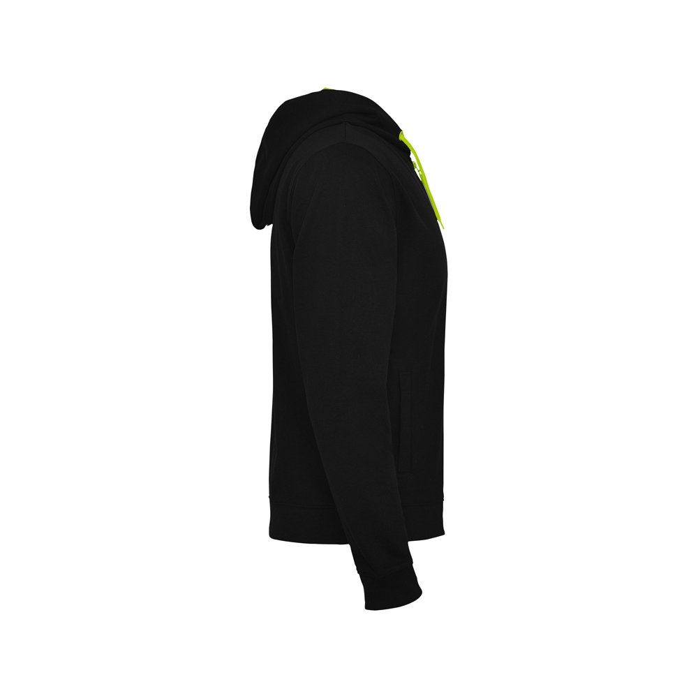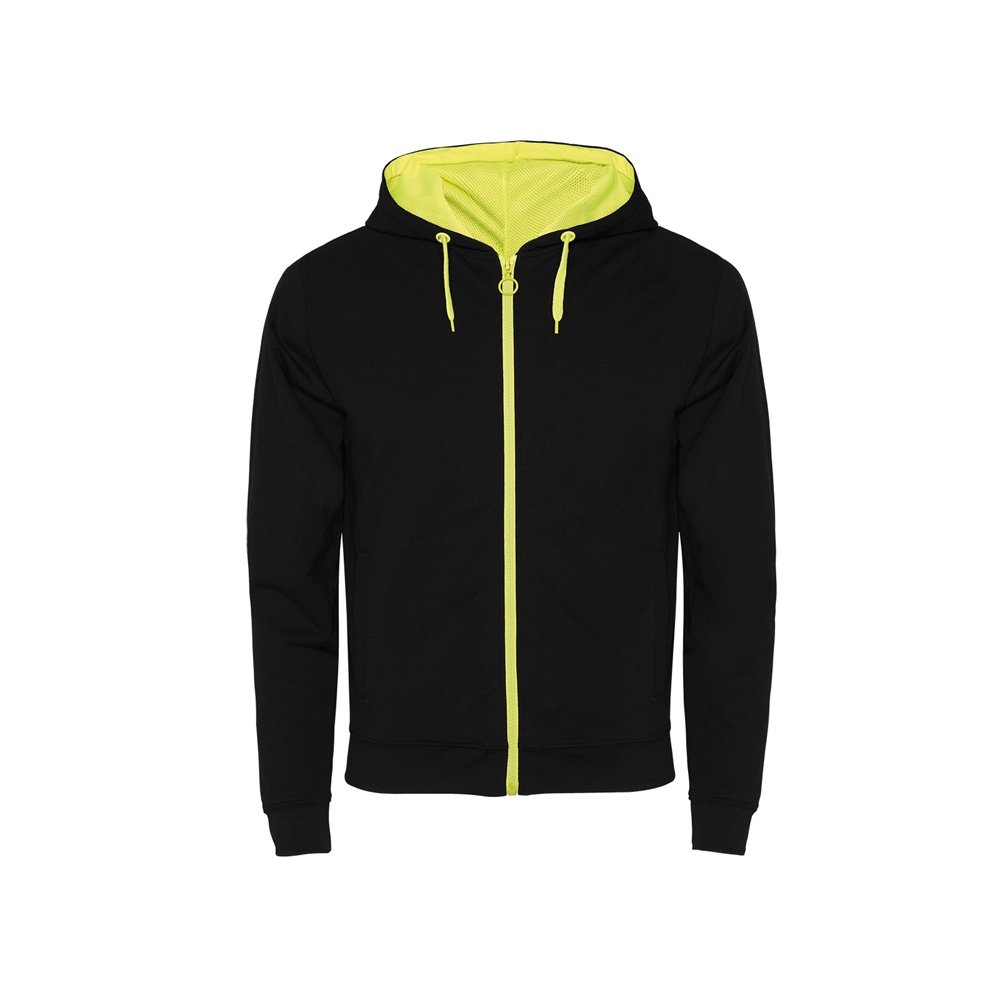 - Толстовка на молнии из френч терри без начеса с деталями неонового цвета. Центральная молния с контрастным пуллером. Подкладка капюшона из микроперфорированного полиэстера контрастного неонового цвета. Шнур капюшона и айлетсы контрастного неонового цвета. Риб 1х1 на манжетах и внизу изделия. Два боковых кармана с широкой листочкой. Укрепляющая строчка внутри горловины.