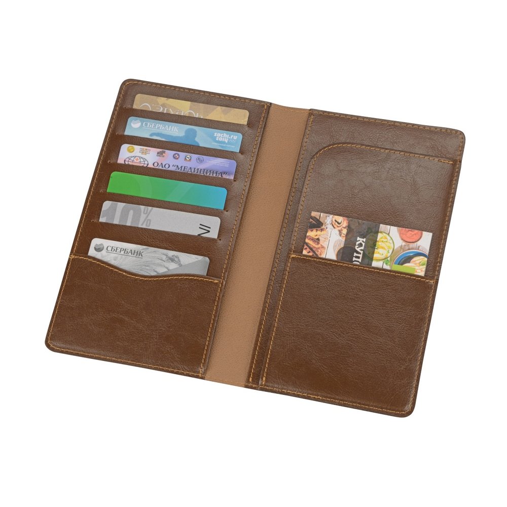- Стильный аксессуар для любителей путешествий, а также людей, часто бывающих в командировках. Трэвел-портмоне из приятной на ощупь натуральной кожи оснащен отделением для купюр и множеством кармашков под визитки или пластиковые карты.