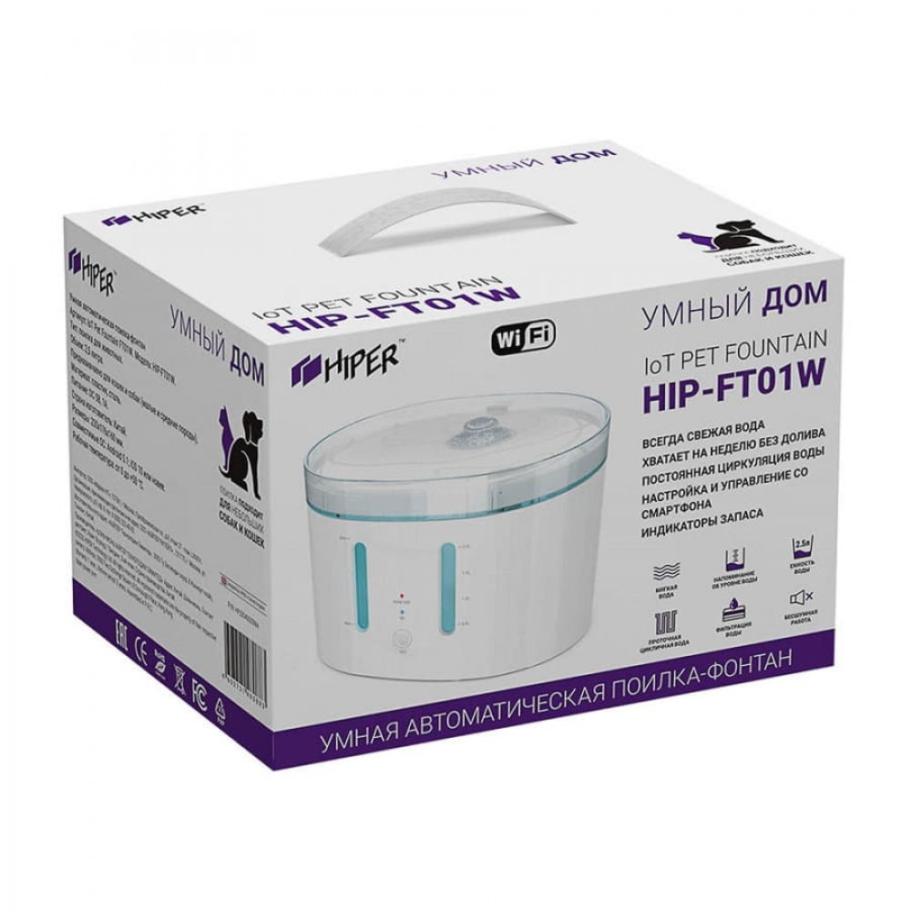 - Умная автоматическая поилка-фонтан для кошек и собак. Большая емкость позволит поить питомца удаленно из любой точки мира. Запаса воды хватит на неделю без долива, а постоянная циркуляция сохранит ее свежесть. Встроенная камера, микрофон и динамик позволят не только увидеть и услышать Вашего питомца, но и пообщаться с ним голосом. Вашему любимцу не будет одиноко, а Вы всегда будете за него спокойны. Подключение при помощи WIFI Полный контроль через приложение HIPER IOT (доступно для iOS и Android). Выдача воды по расписанию и возможность попоить в любой момент через приложение. Компактный корпус с большим запасом воды.