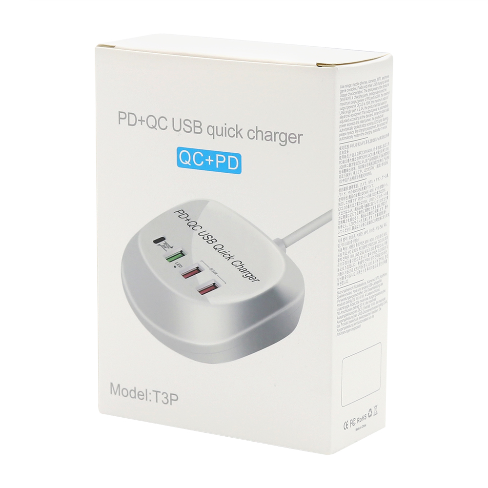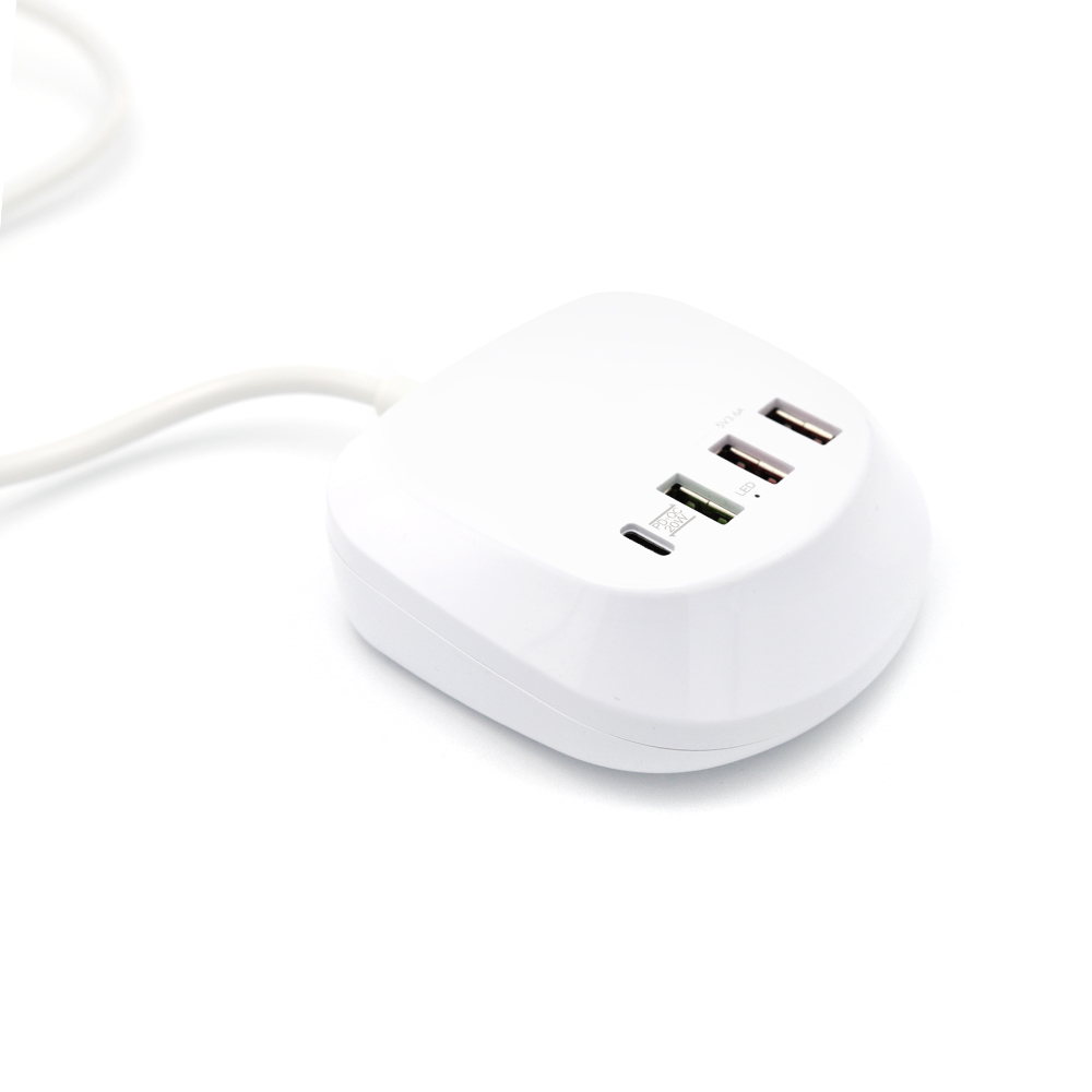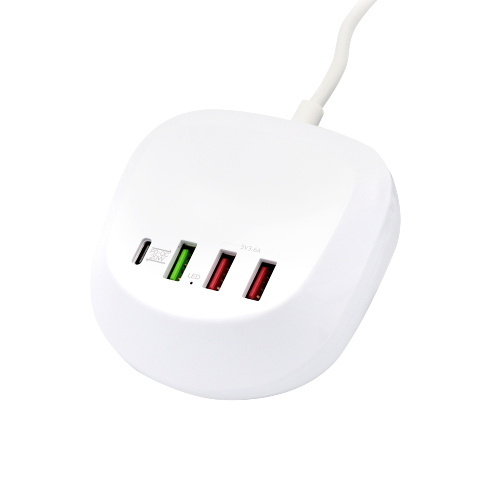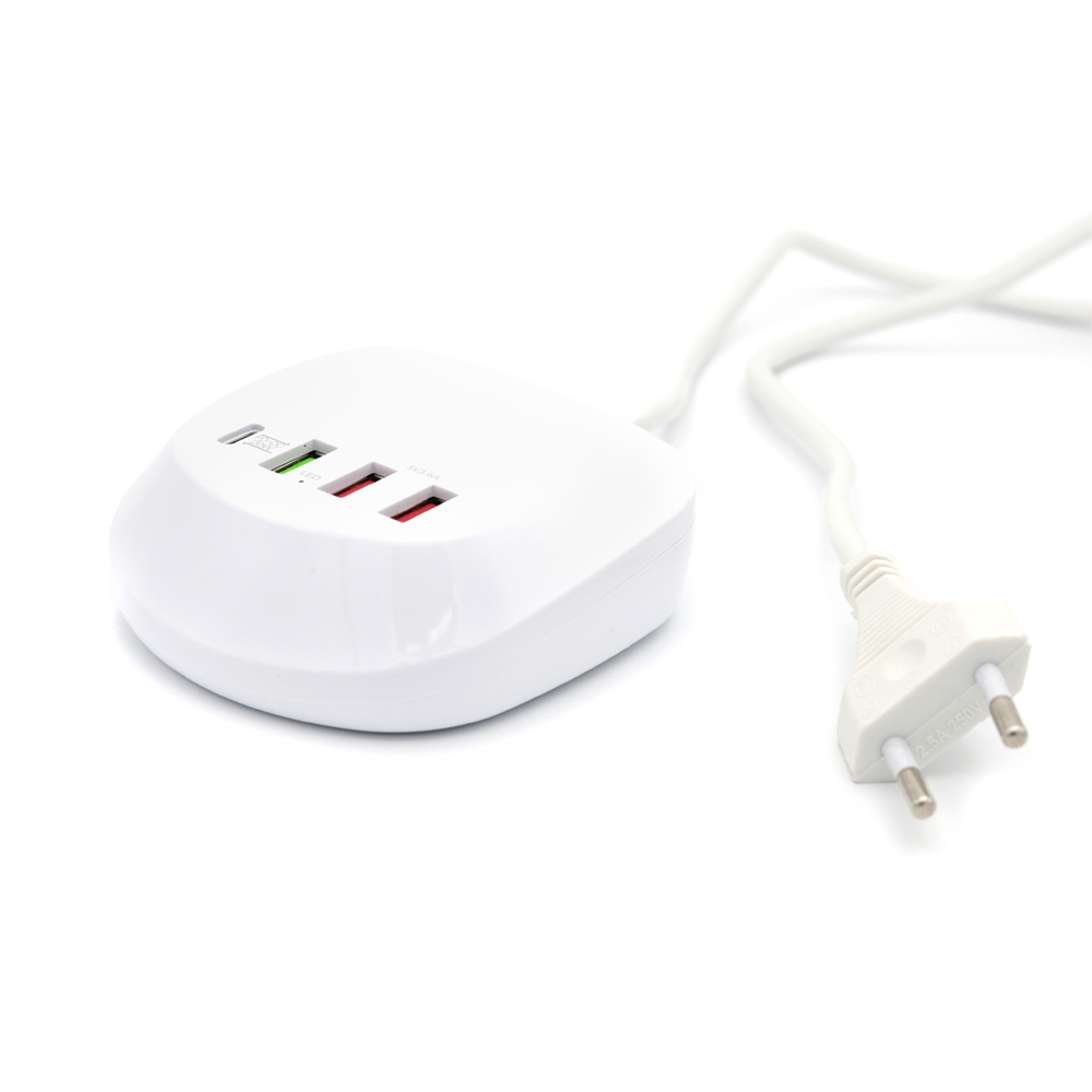 Универсальная платформа для зарядки гаджетов, с возможностью одновременного подключения 4 устройств. Порт Type-C подойдет для ноутбуков и нетбуков, порты USB позволяют при помощи кабеля с нужным типом порта осуществить зарядку мобильных телефонов, планшетов, наушников, часов. Наличие порта с функцией QC позволяет заряжать устройство в ускоренном режиме. Платформа выполнена из негорючего пластика, имеет встроенные компоненты предохраняющие устройства от перепадов напряжения