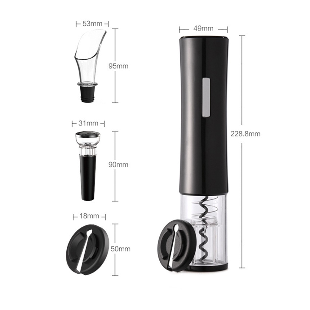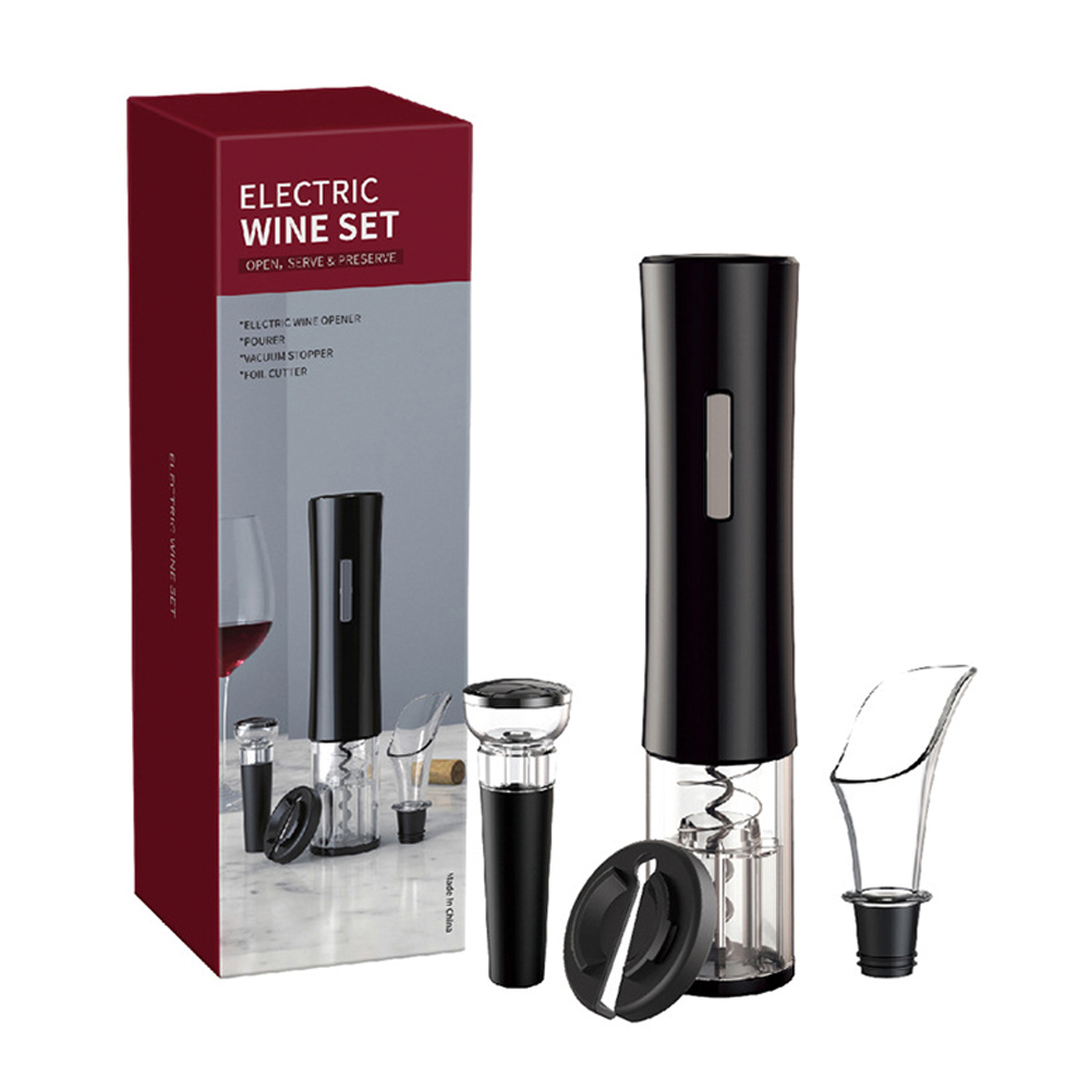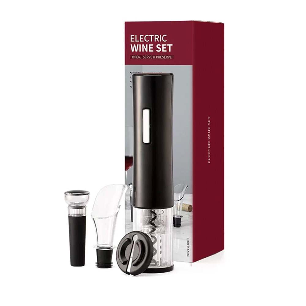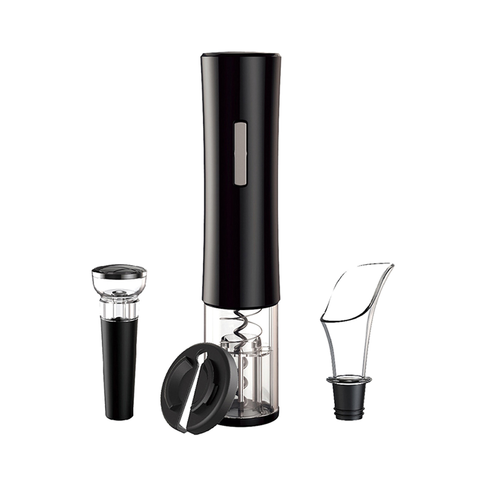 Набор включает в себя: - электрический штопор (работает от батареек типа АА, в комплект не входят) - резак для срезания фольги - аэратор (служит для аэрации и насыщения напитка кислородом) - пробка (для закупоривания открытой бутылки).