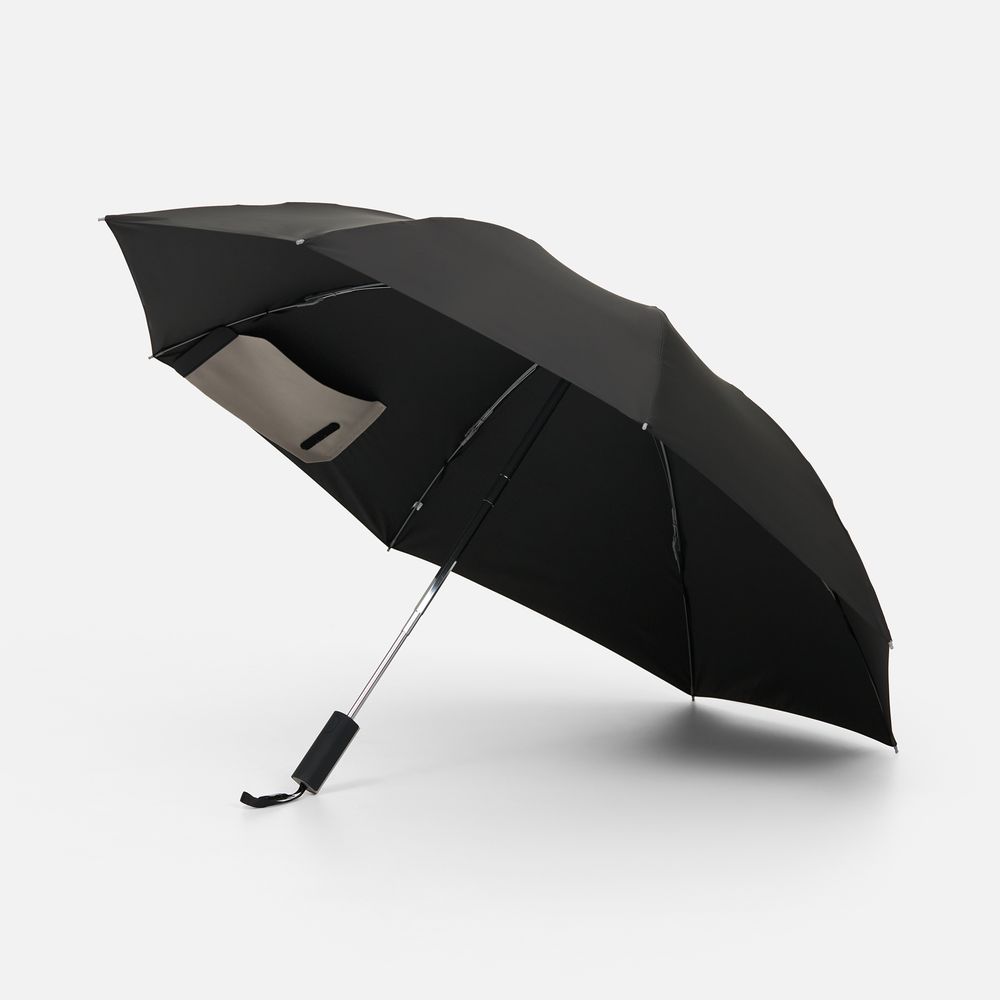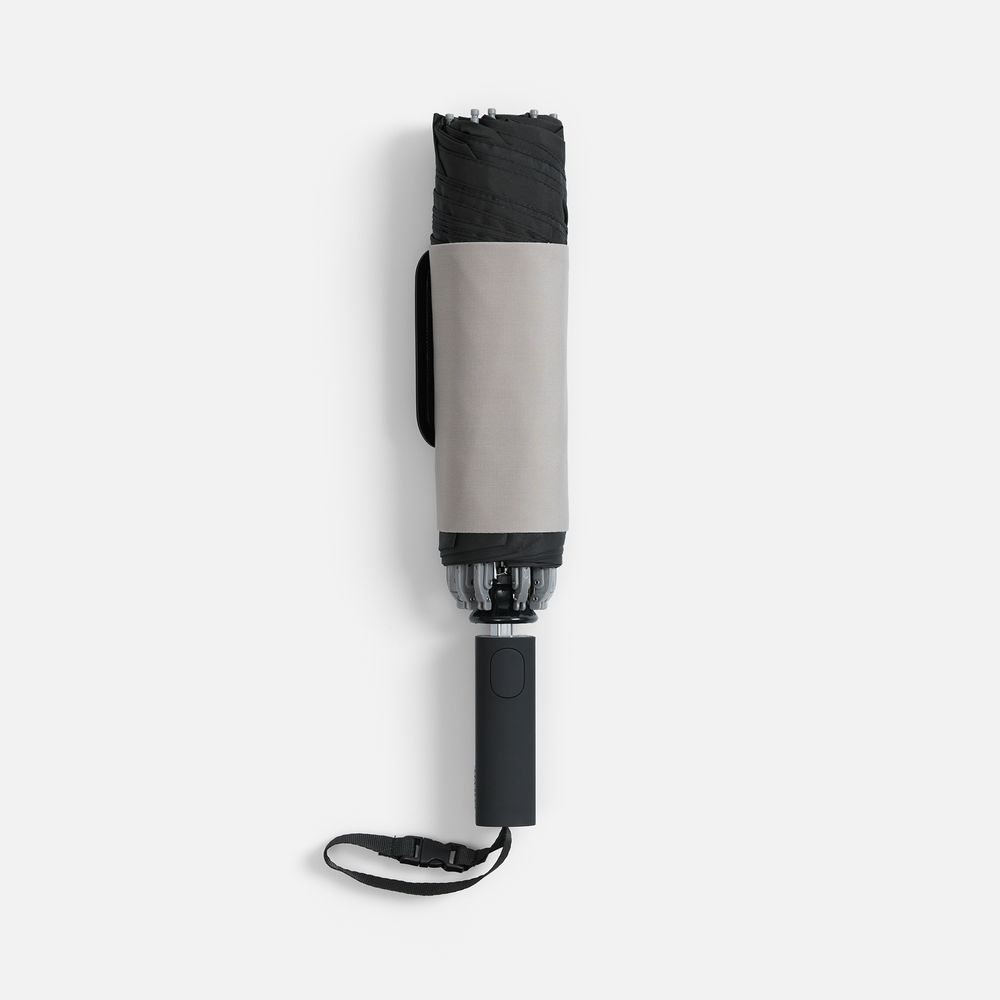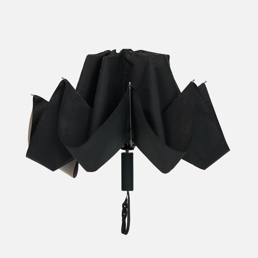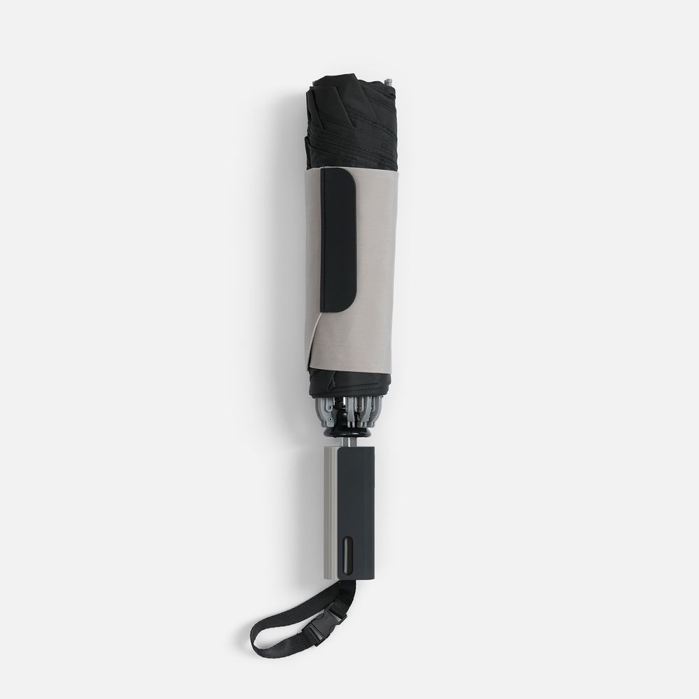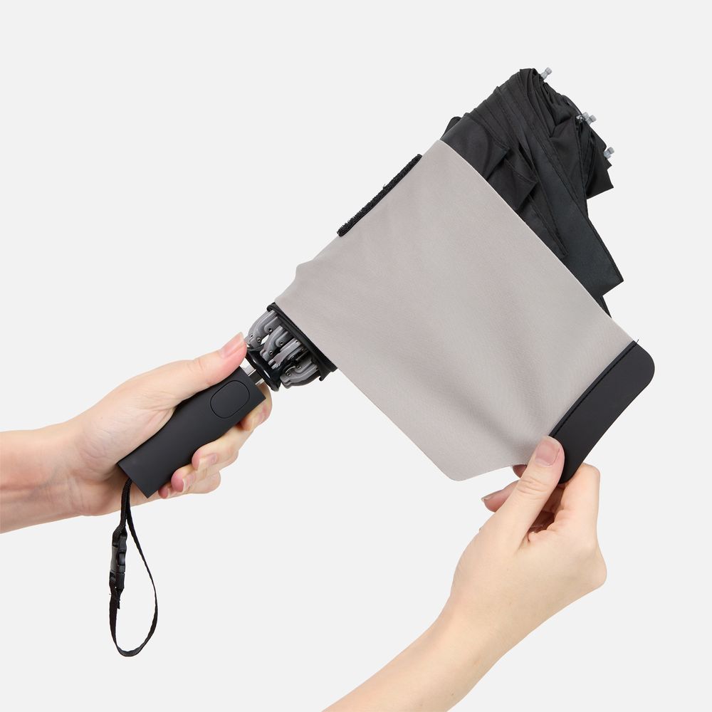 Складываясь после дождя, он прячет мокрую поверхность внутри, а сухая остается снаружи: в закрытом положении зонт не побеспокоит окружающих и не намочит одежду. Благодаря застежке на ремешке зонт удобно подвесить, например, на рюкзак.