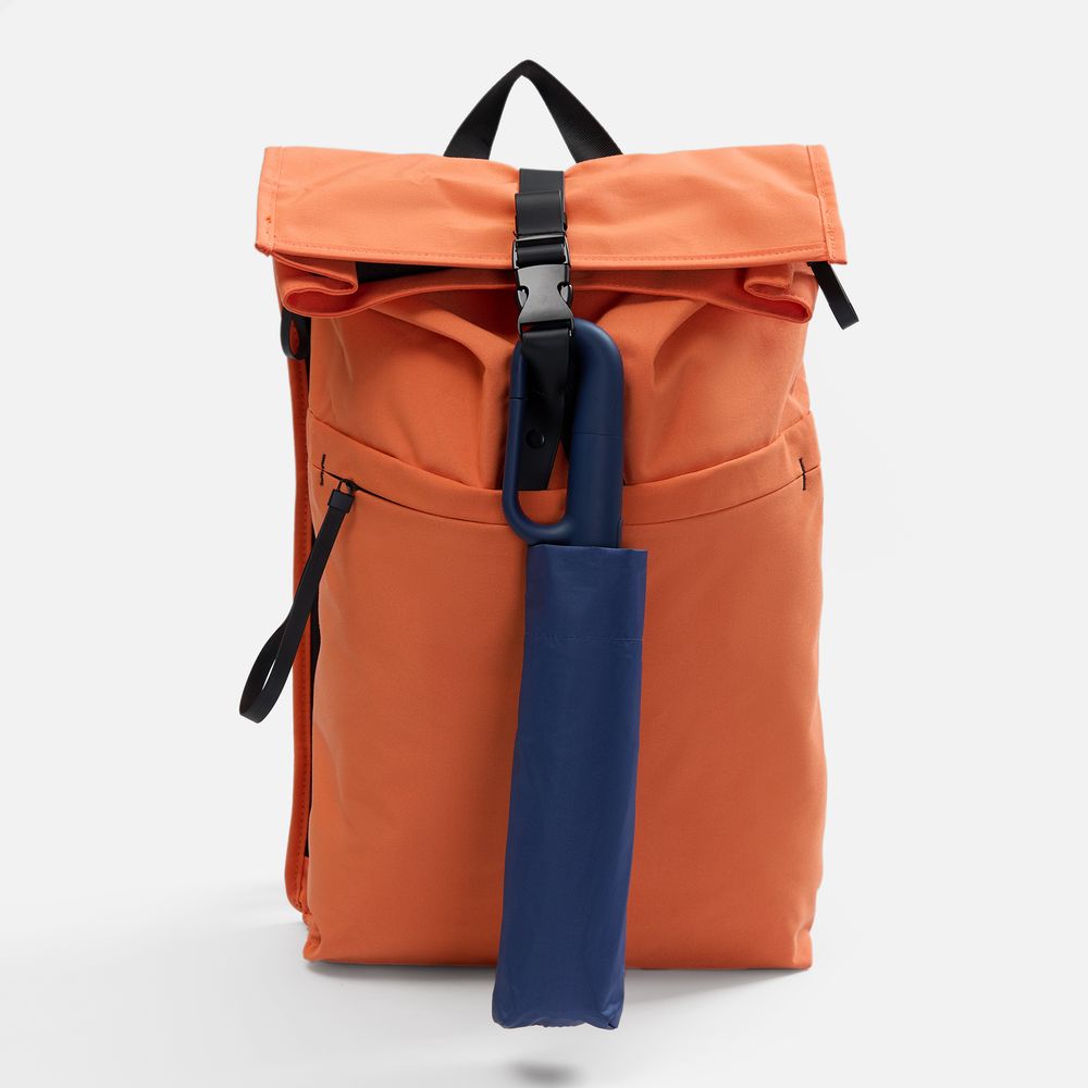 Преимущество обратного сложения заключается в том, что при закрытии внутренняя поверхность зонта остается снаружи, а мокрая сторона — внутри. За ручку-карабин удобно подвесить зонт на рюкзак или сумку.