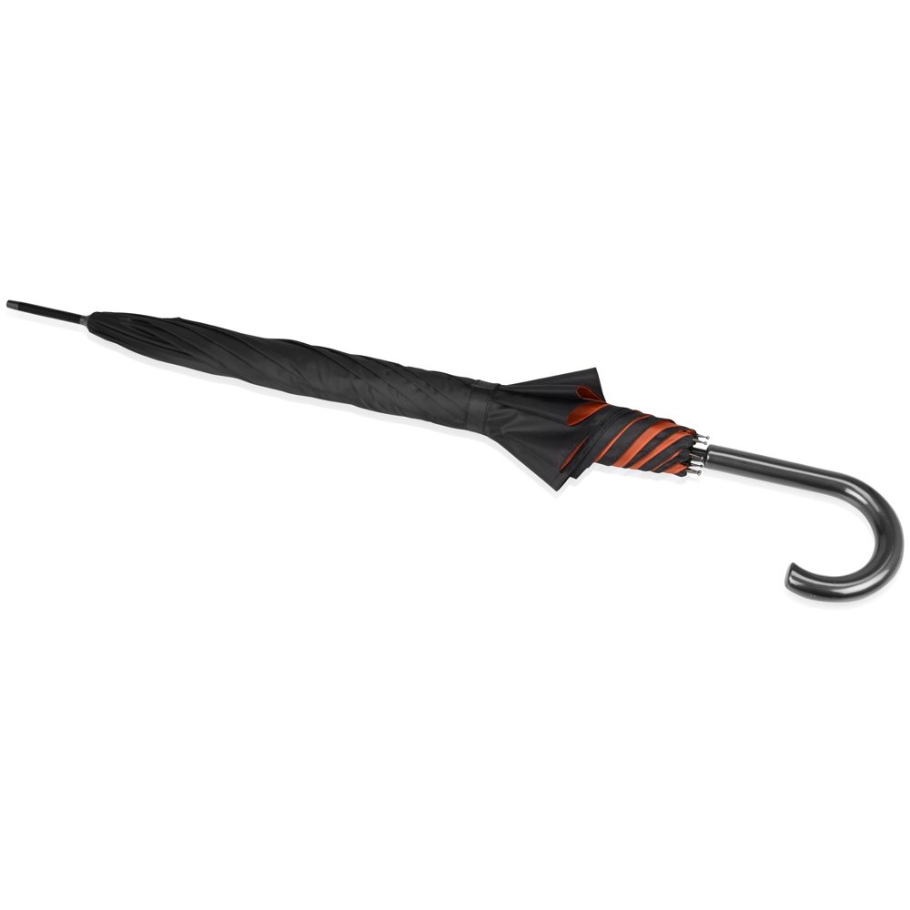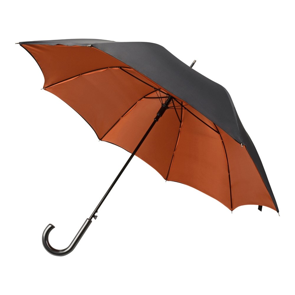 - Интересный двухцветный зонт-трость спасет вас от дождя и легкого снега. Внешняя поверхность купола окрашена в черный цвет, а внутренняя имеет яркий, насыщенный оттенок, что непременно привлечет внимание. На купол зонта можно нанести логотип.